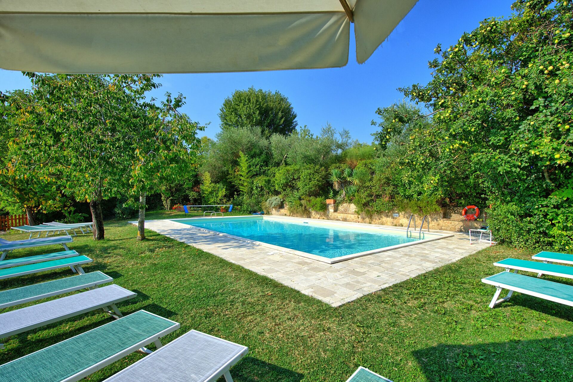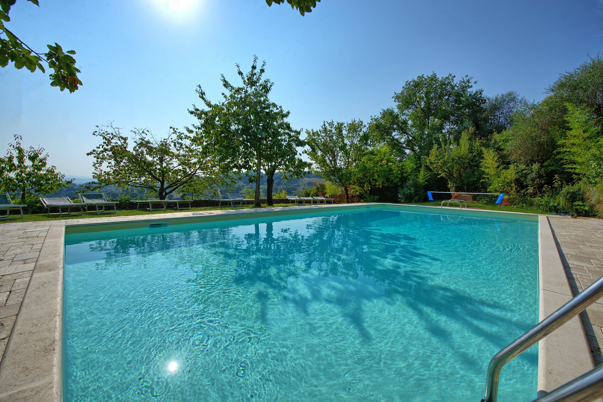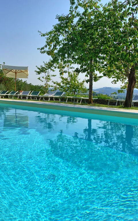 - panoramica piscina privata riservata all'uso esclusivo degli ospiti di Villa Sarteano (12 x 6 m - profondità minima 1,2 m - profondità massima 2,4 m ), doccia esterna (acqua fredda) in prossimità della piscina