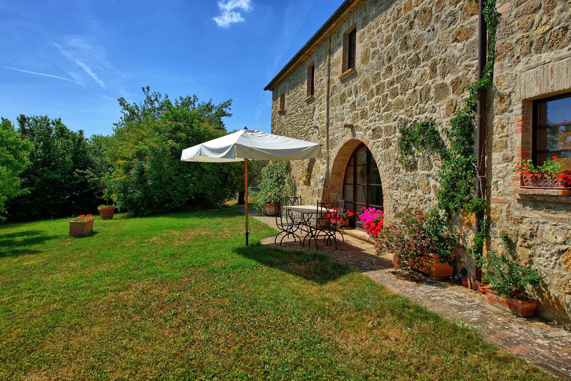 All'esterno, il casale in affitto è avvolto dallo splendido paesaggio collinare della Val d'Orcia, ricco di vegetazione e campi coltivati. La piscina privata è ubicata in posizione panoramica ed è dotata di lettini e ombrelloni: è il luogo perfetto per trascorrere lunghe ore rilassandosi e rinfrescandosi in compagnia di amici e familiari. Un'area attrezzata con barbecue, tavoli e sedie è a disposizione degli ospiti per poter organizzare banchetti estivi da gustare all'aperto, ammirando la meravigliosa vista panoramica che si estende sulle colline e sulle vallate circostanti.