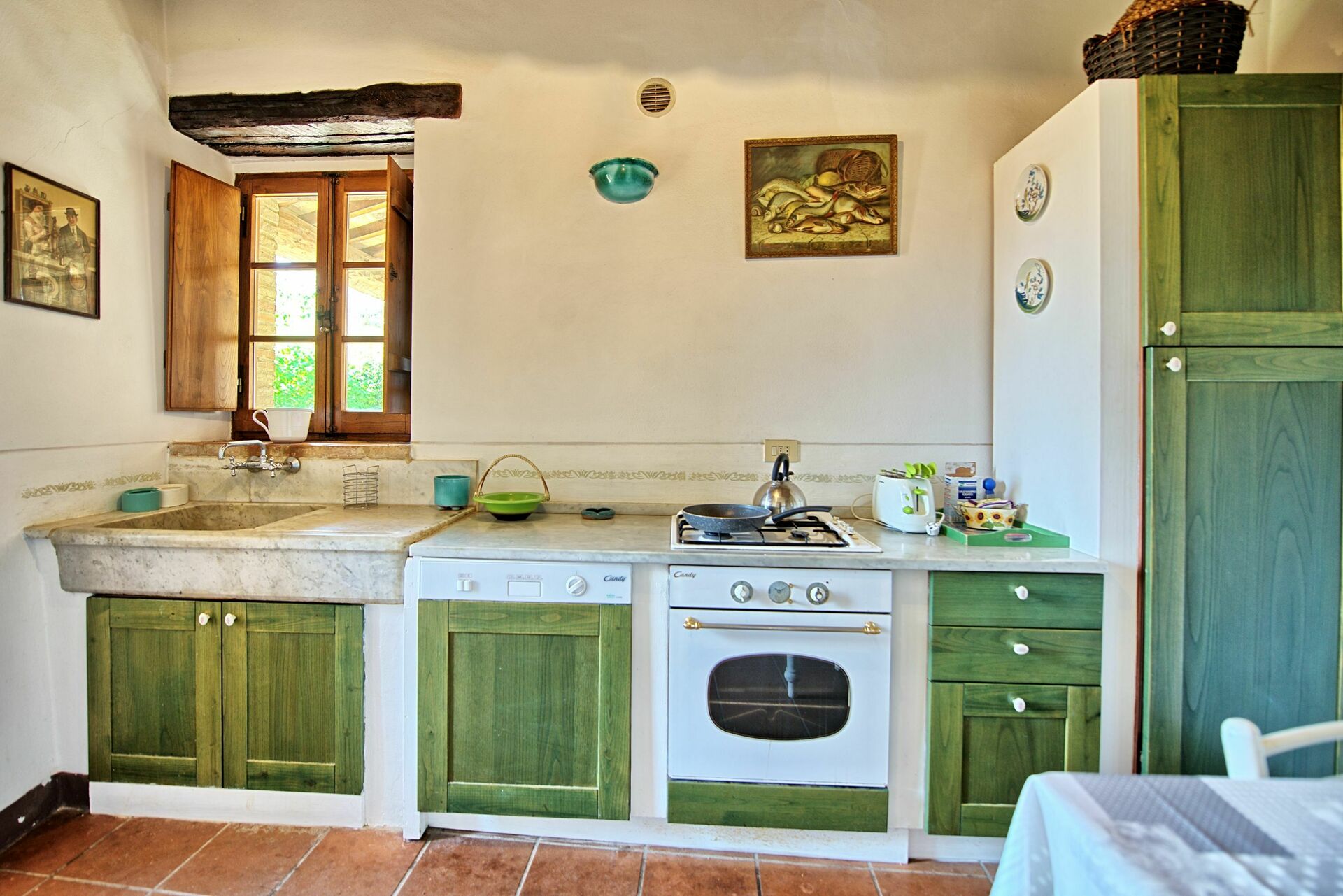 1 gradino più in alto: cucina (forno, freezer, tostapane, lavastoviglie).