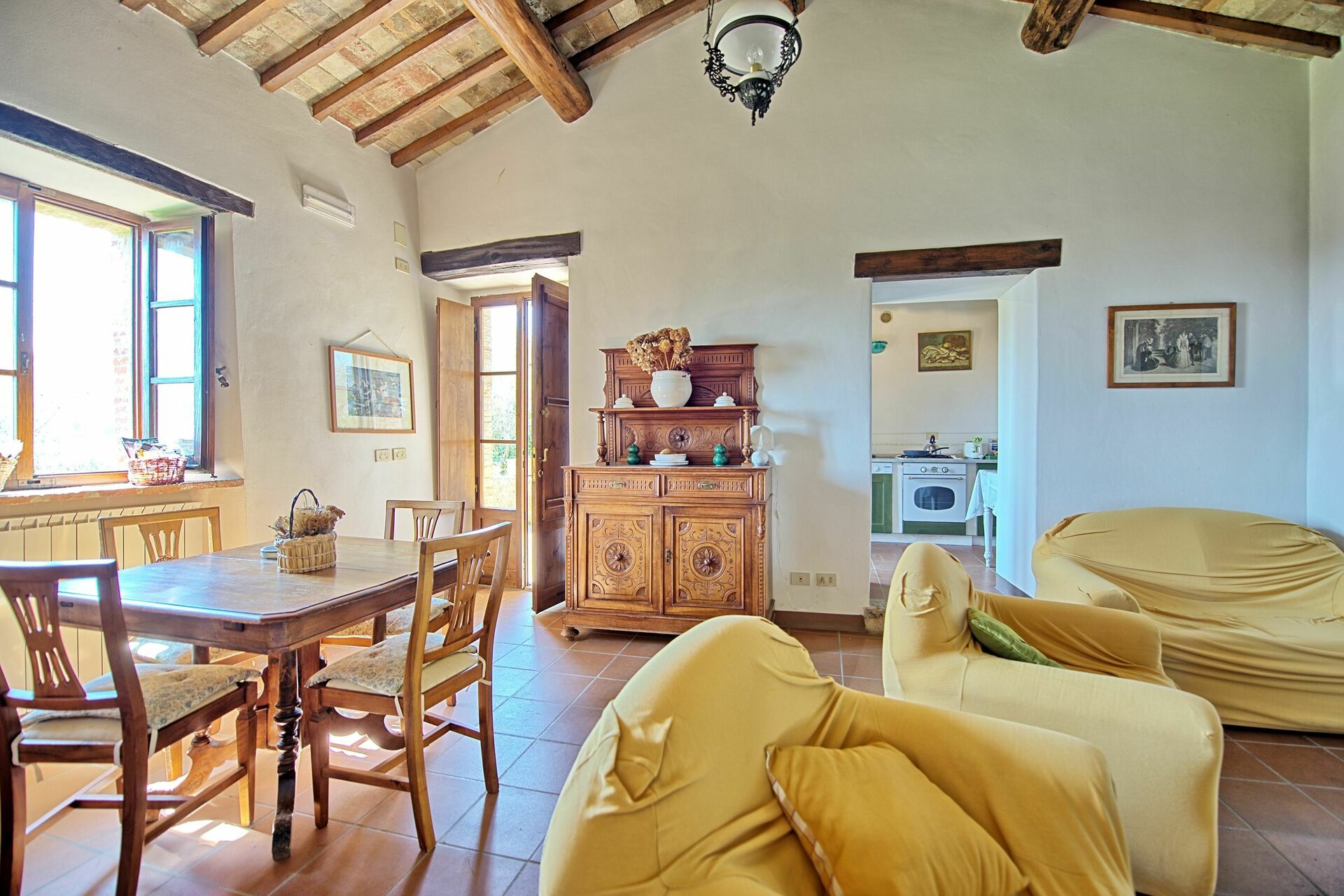 La zona giorno di questo appartamento è sufficientemente ampia per ospitare tutti insieme gli ospiti della villa.