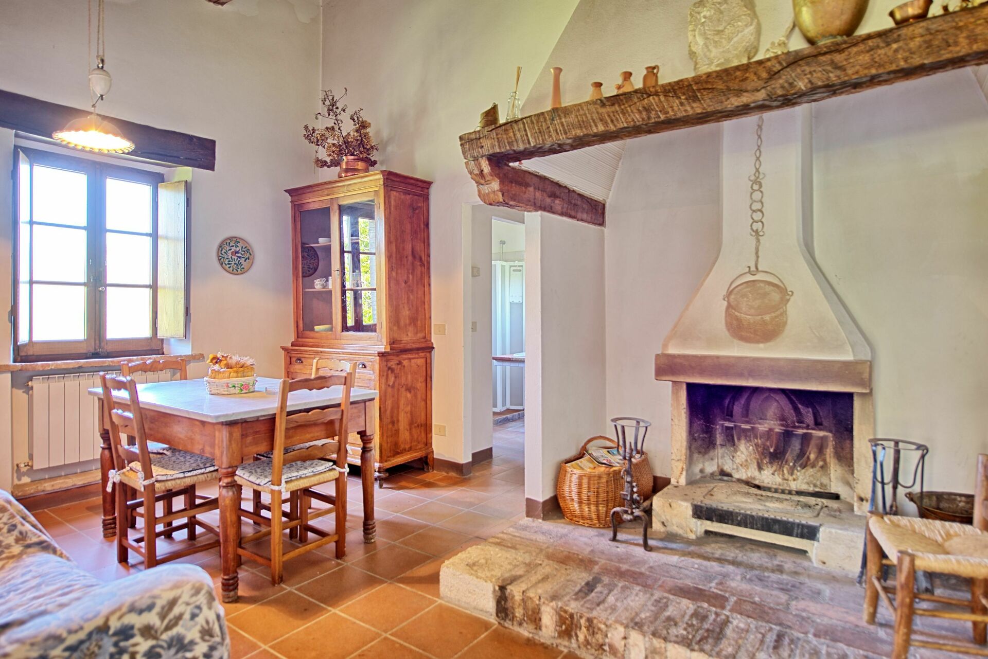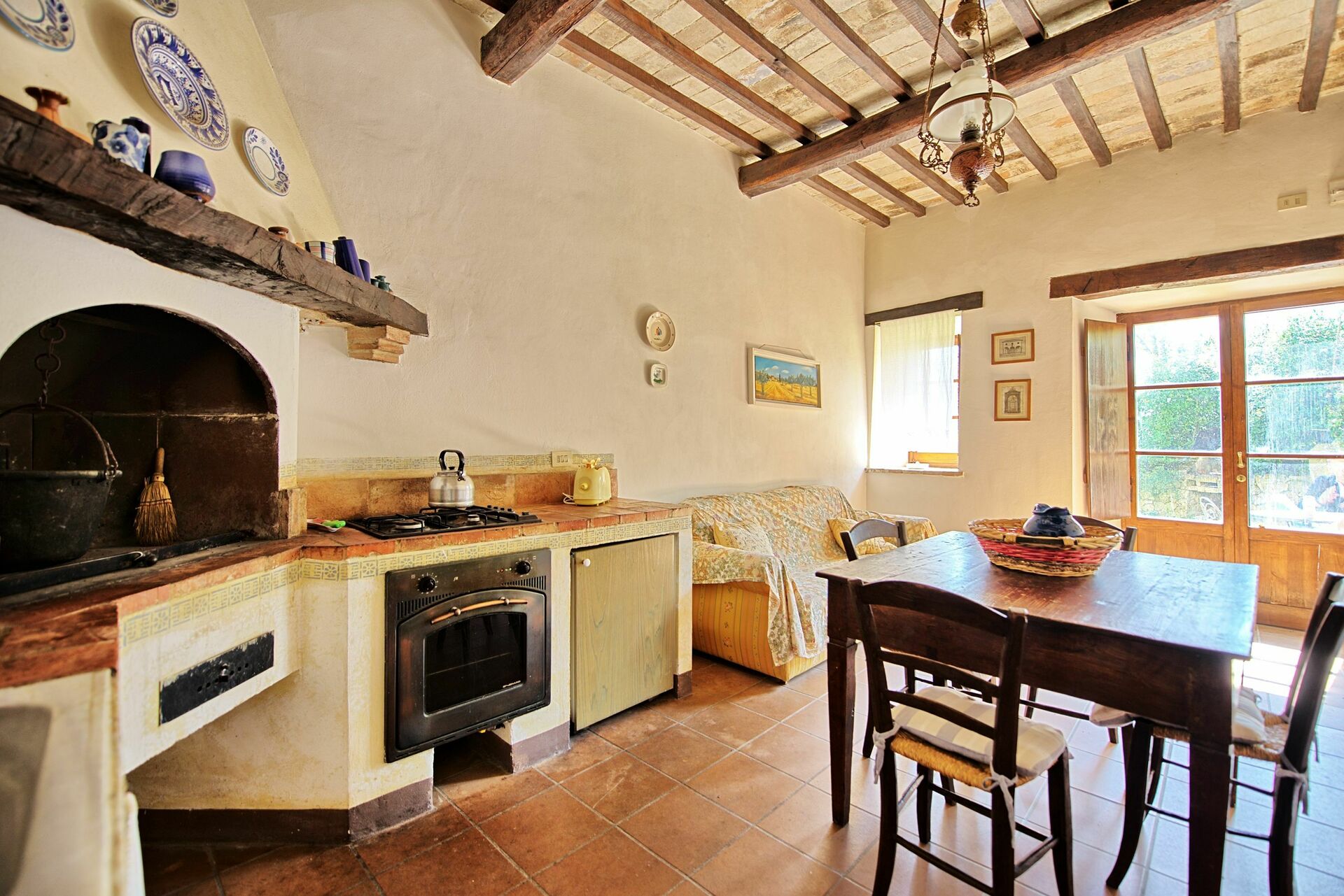 Piano terreno: cucina (forno, piccolo freezer), soggiorno con camino e zona pranzo, camera matrimoniale, camera con 1 letto singolo, bagno con doccia.