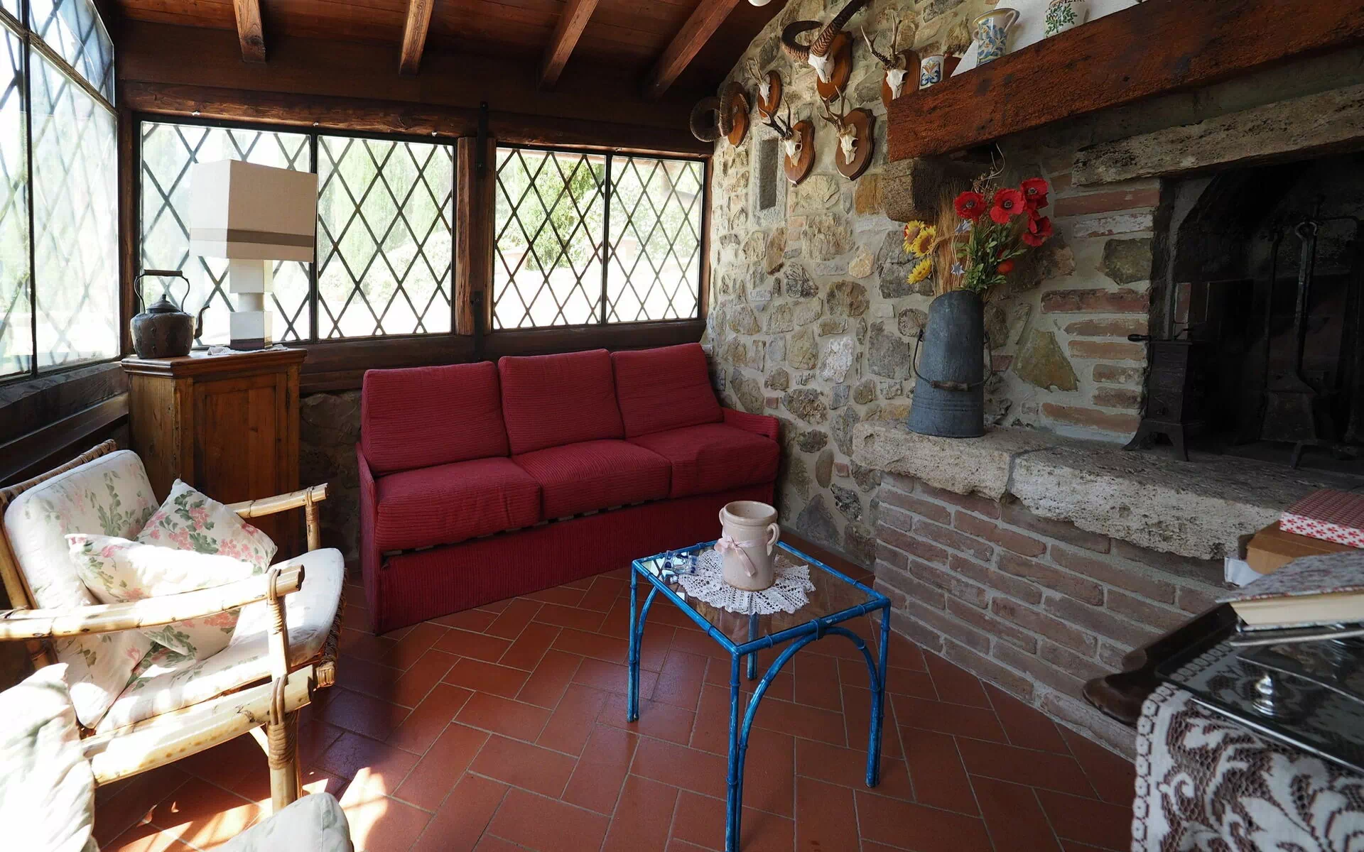 1° Piano: camera matrimoniale con bagno con doccia, camera con 2 letti singoli e bagno con doccia. Spaziosa terrazza esterna arredata con tavolo, sedie e barbecue, ideale per pasti all’ aperto. Bella vista sulla piscina e sulla campagna circostante.