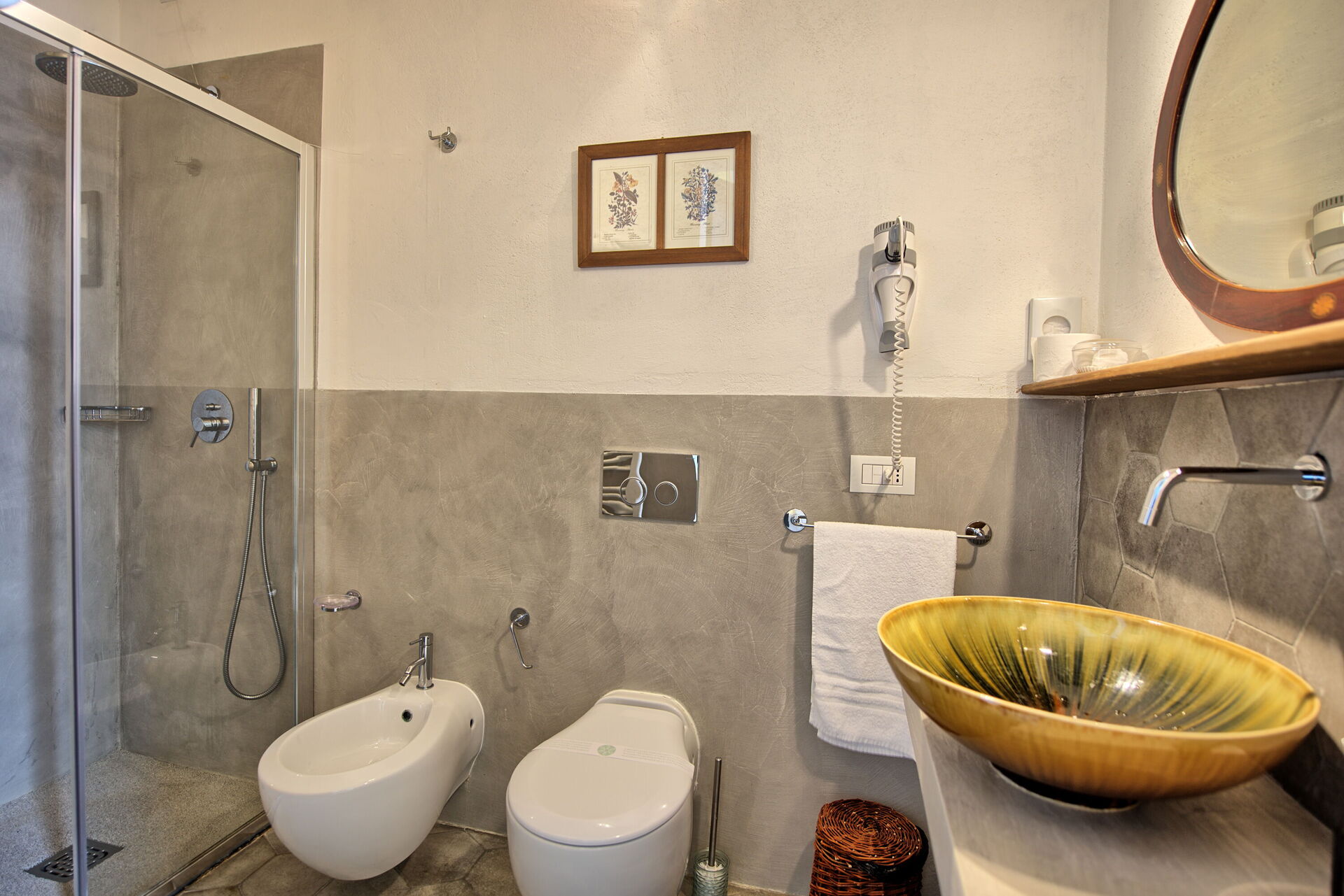 Piano terreno: camera matrimoniale (aria condizionata) panoramica con bagno privato con doccia, accesso ad una terrazza privata.