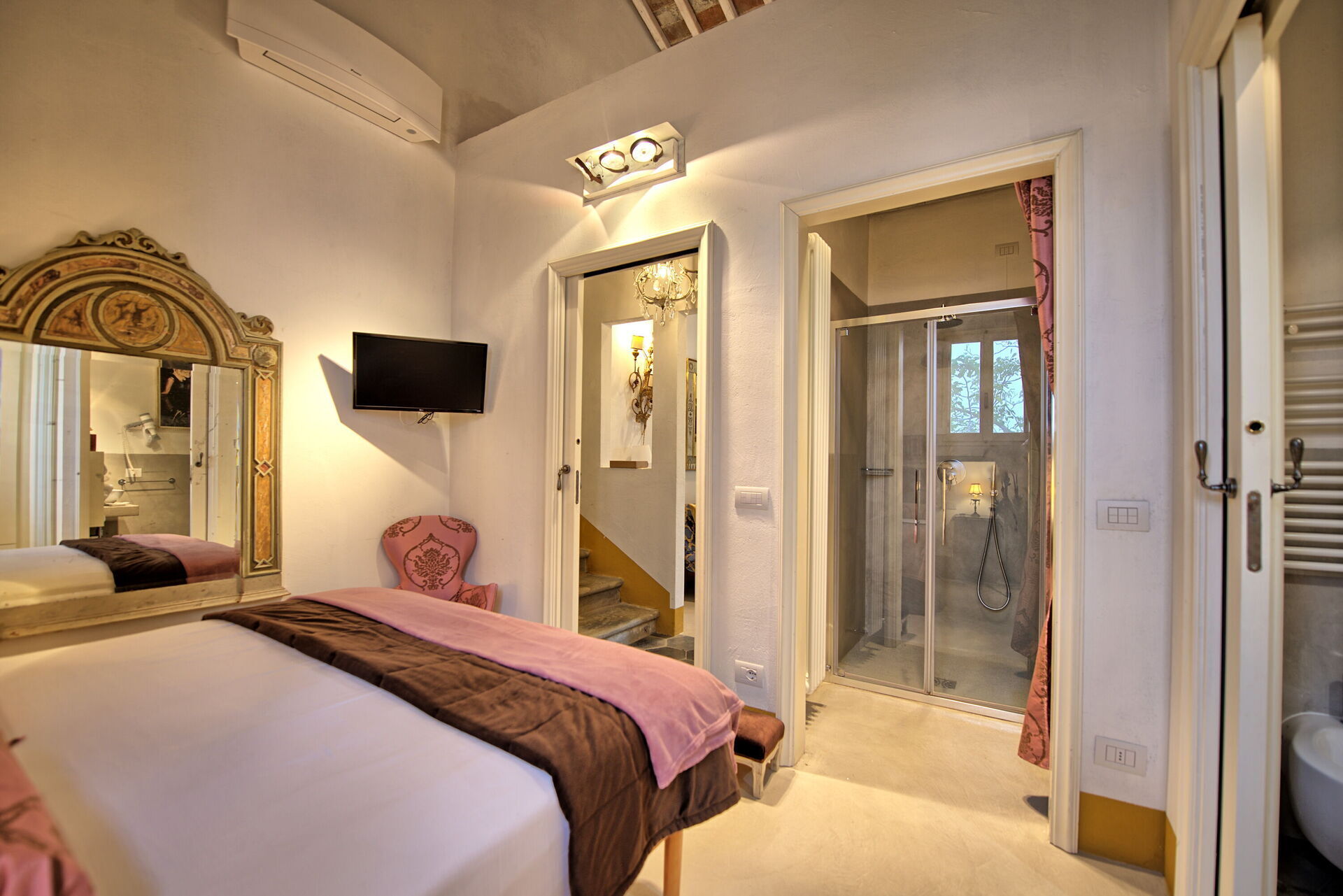 Piano inferiore (alcuni gradini sotto): 2 camere matrimoniali (aria condizionata) ognuna con bagno privato con doccia.