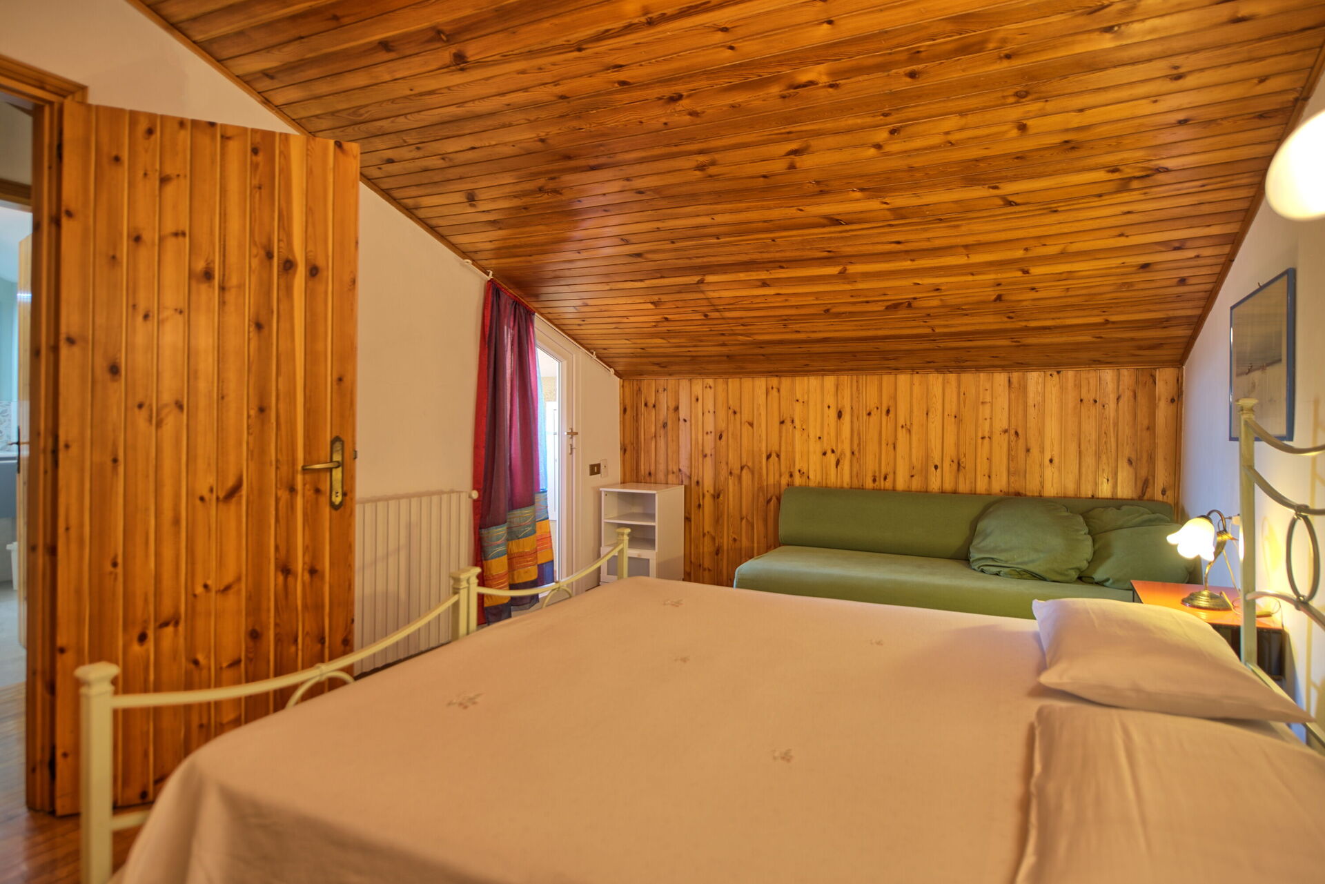 Una scala porta al piano superiore, in cui si trovano due camere (una matrimoniale ed una doppia) ed un bagno con doccia.
