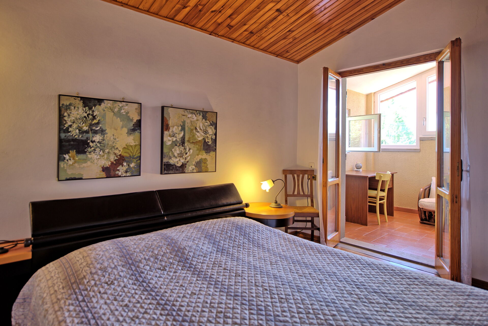 Piano terreno: soggiorno con camino e zona TV (satellitare), camera matrimoniale, bagno con doccia, camera matrimoniale con bagno privato con doccia.