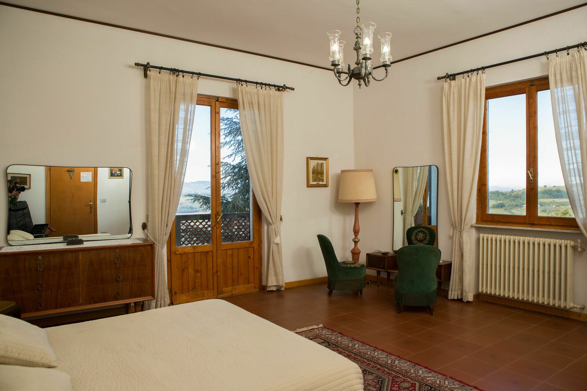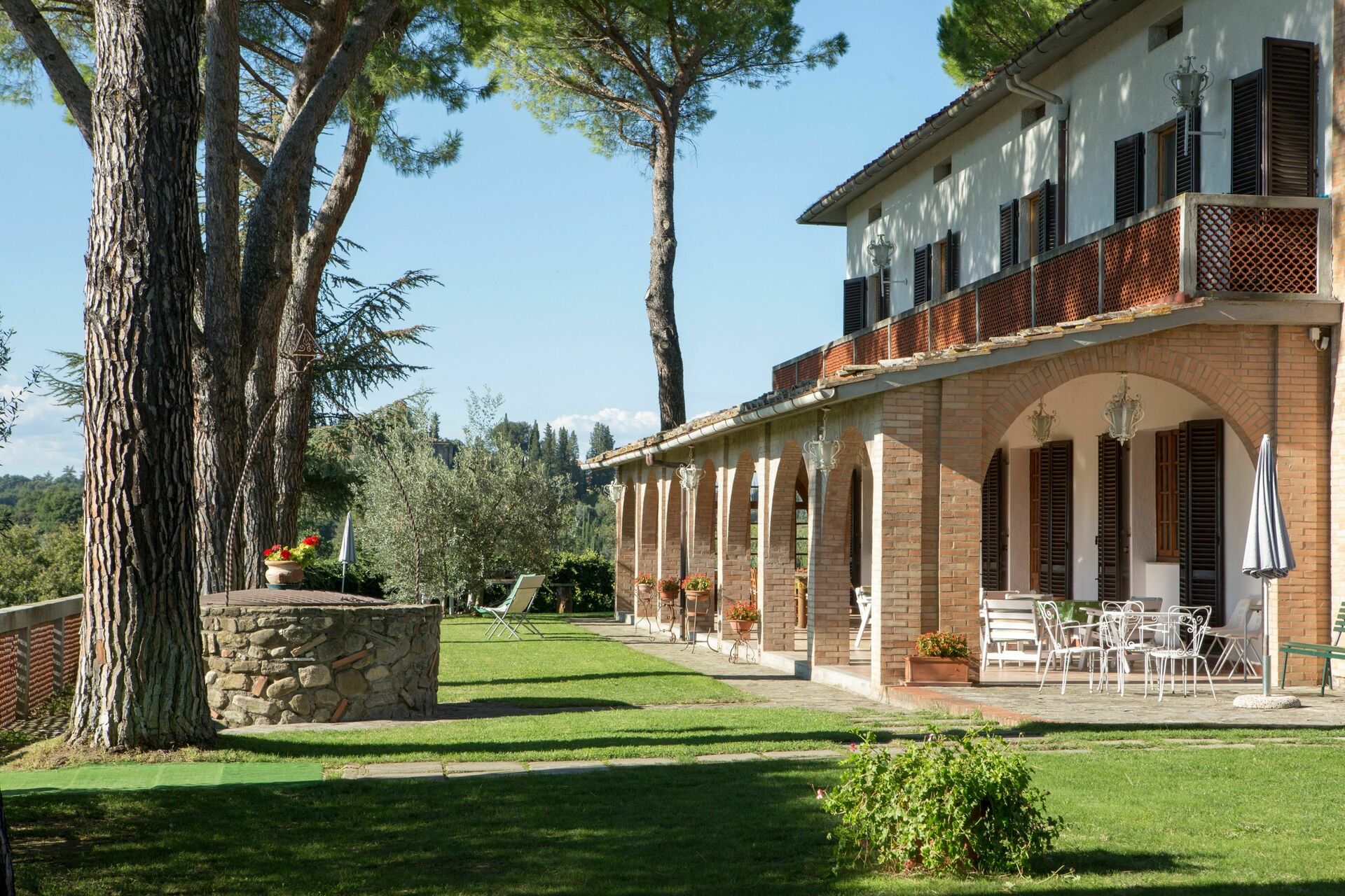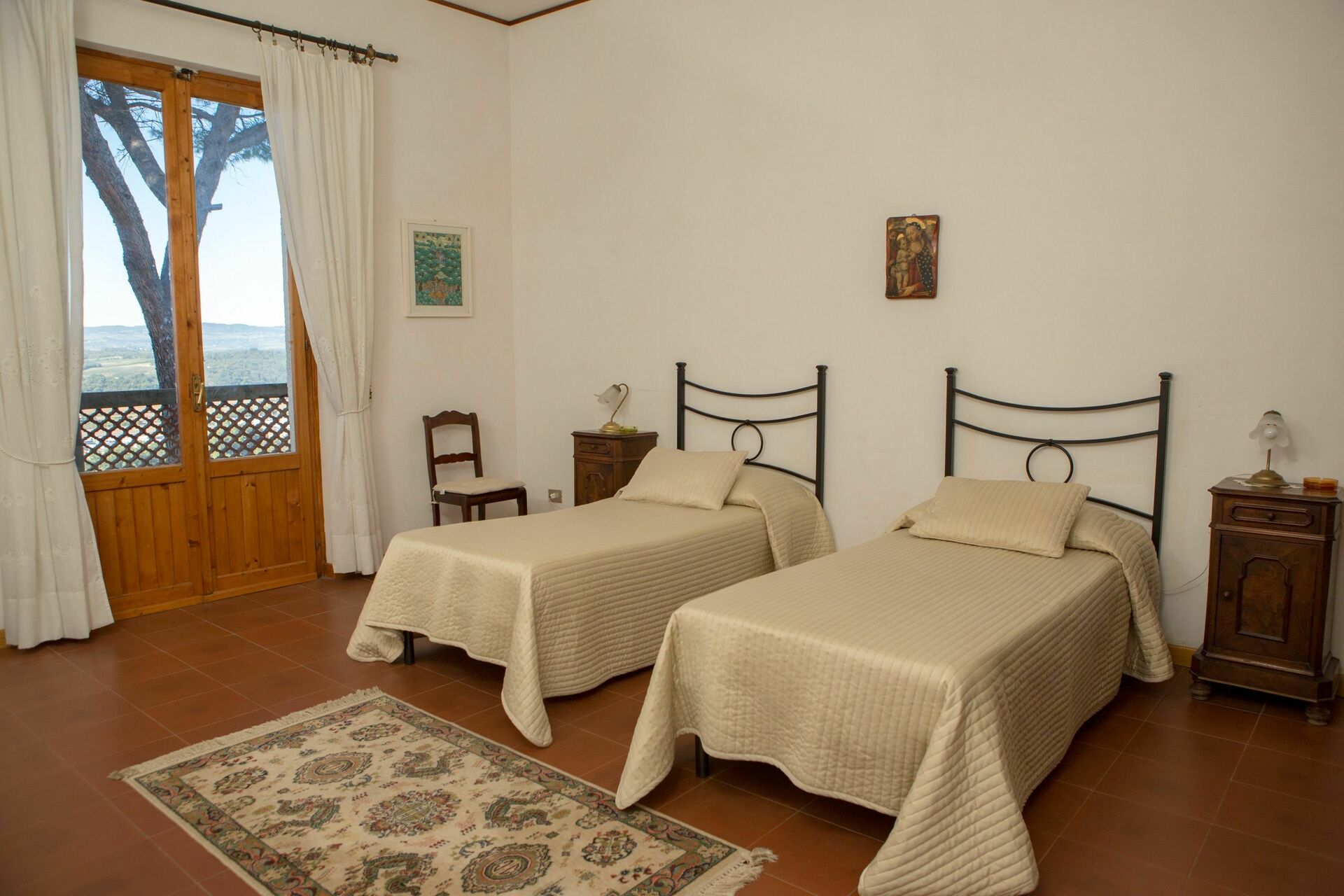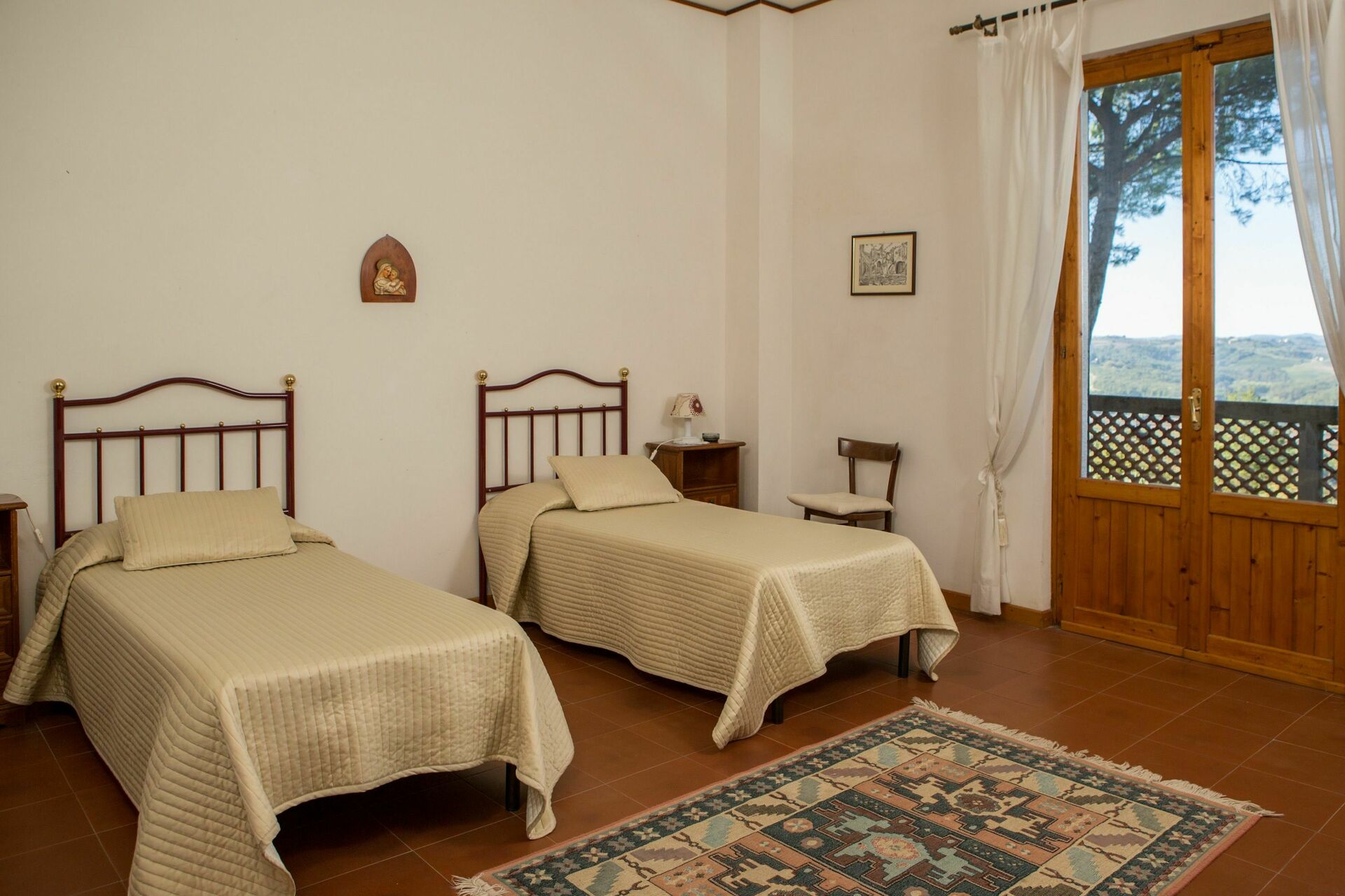 1° Piano: 2 camere entrambe con letto matrimoniale, 2 camere entrambe con 2 letti singoli, 2 bagni ognuno con doccia, bagno con doccia e lavatrice. Ogni camera ha accesso ad un balcone comune che corre lungo la facciata della casa ed offre una bella vista panoramica sulla Valdelsa.