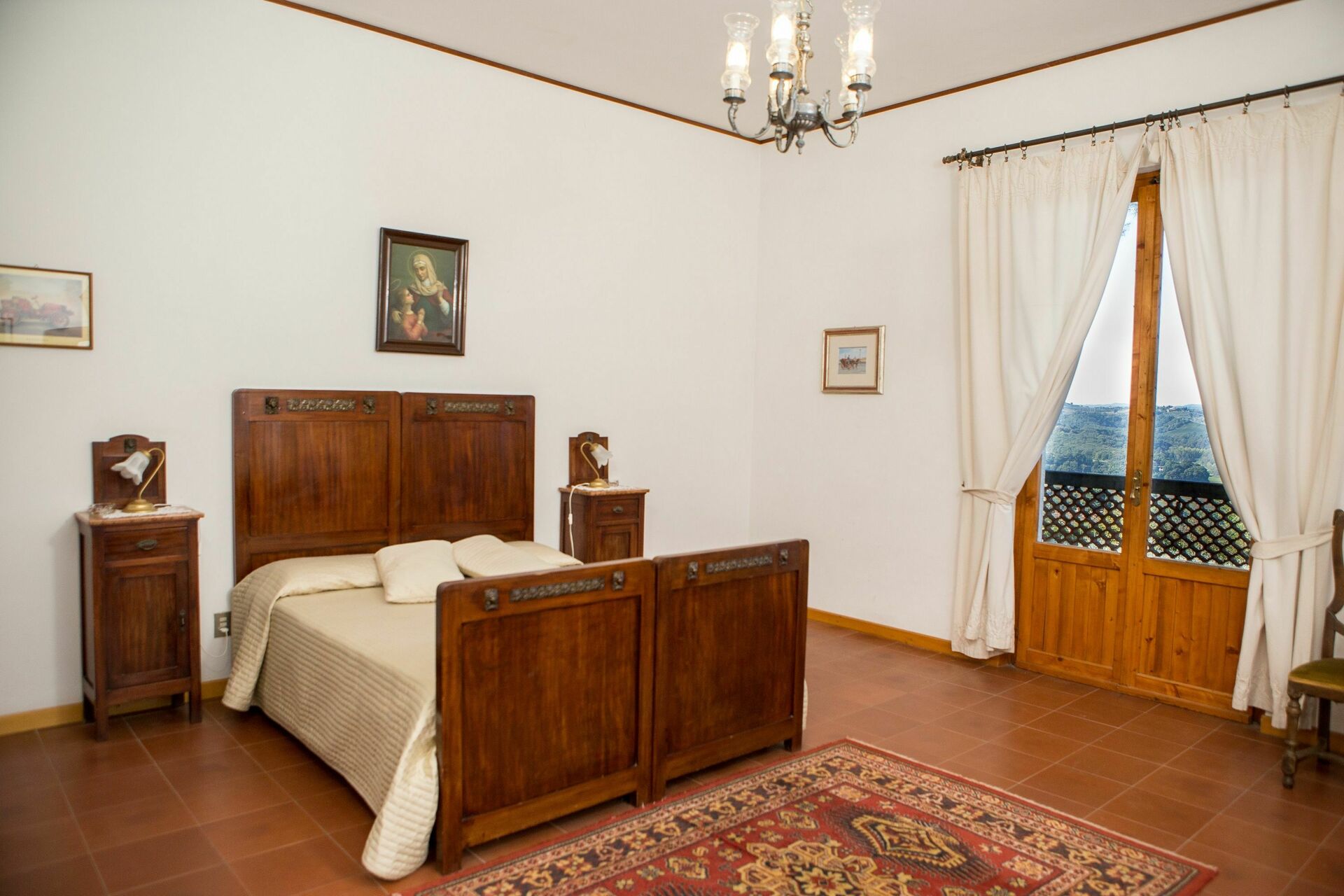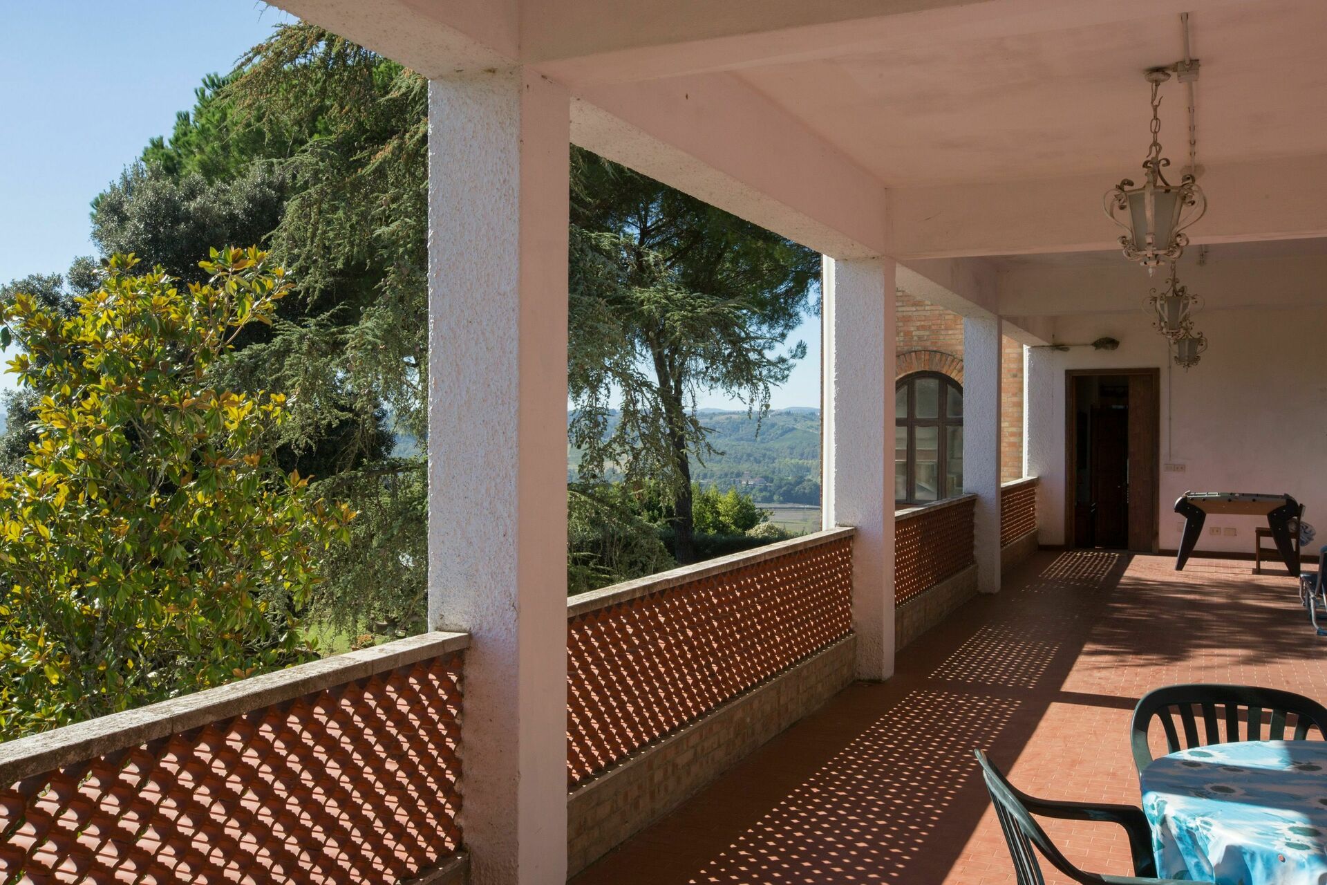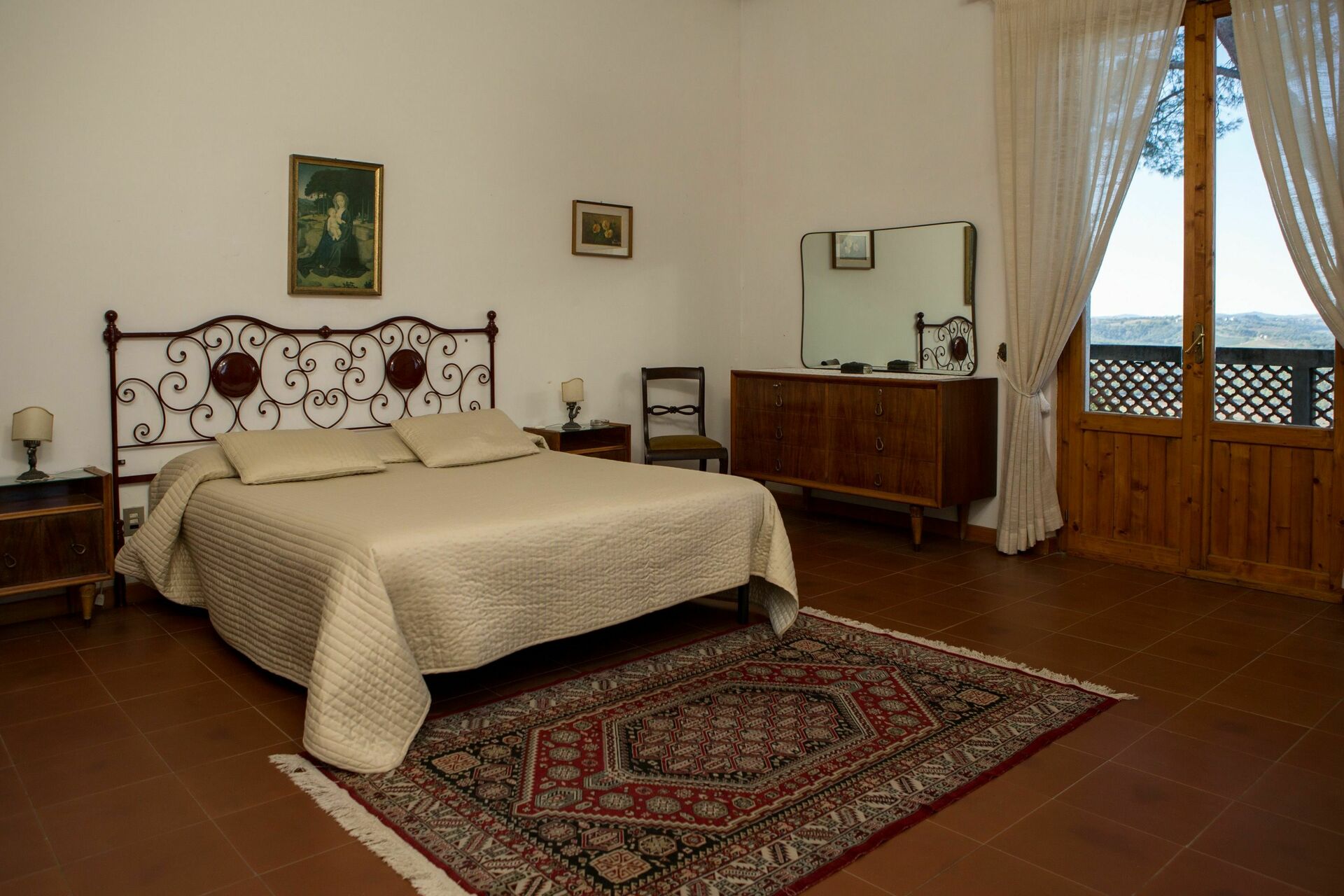 1° Piano: 2 camere entrambe con letto matrimoniale, 2 camere entrambe con 2 letti singoli, 2 bagni ognuno con doccia, bagno con doccia e lavatrice. Ogni camera ha accesso ad un balcone comune che corre lungo la facciata della casa ed offre una bella vista panoramica sulla Valdelsa.