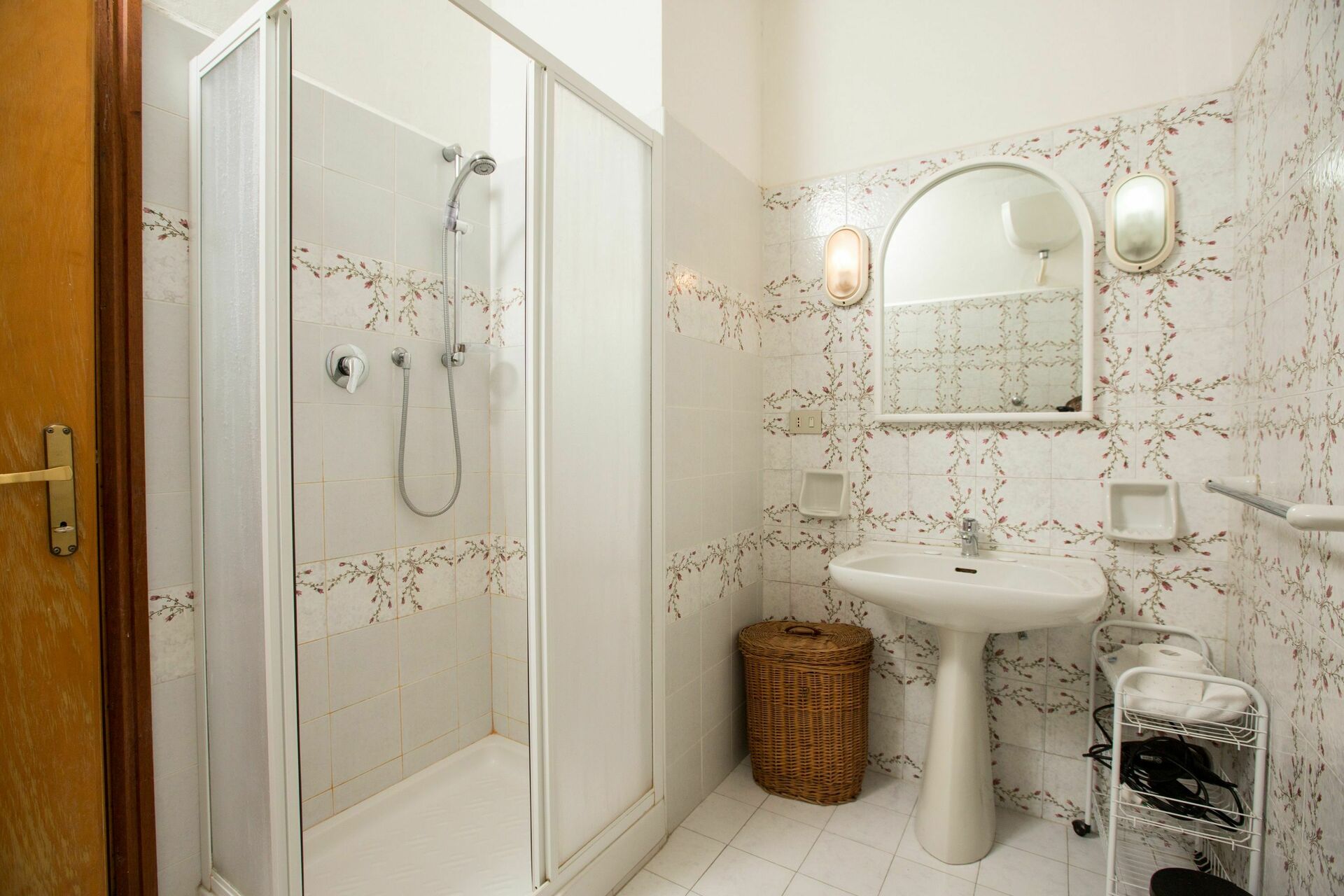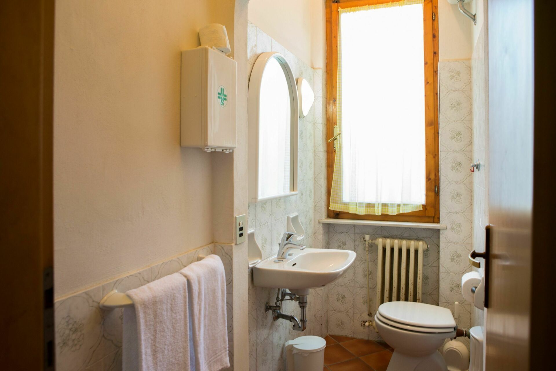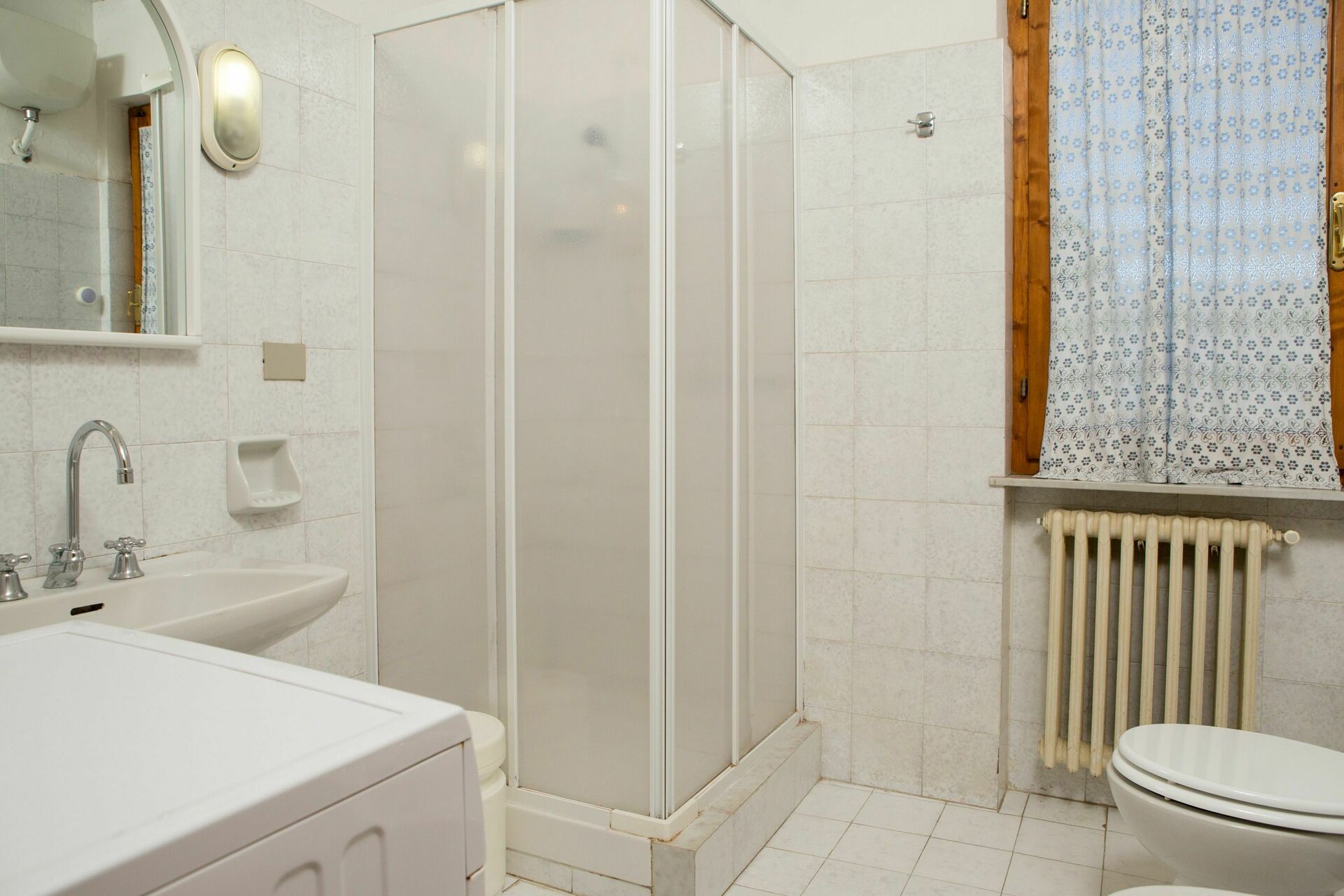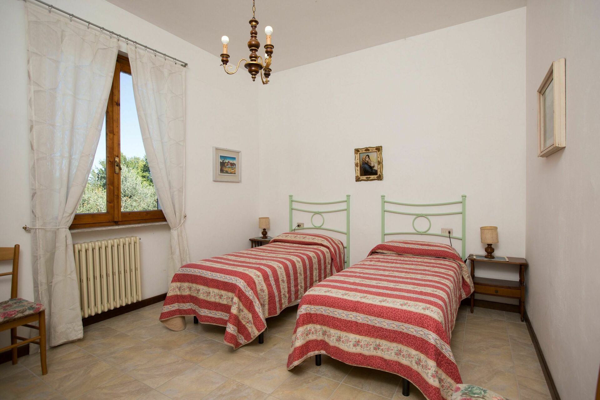 1° Piano: 2 camere entrambe con letto matrimoniale, 2 camere entrambe con 2 letti singoli, 2 bagni ognuno con doccia, bagno con doccia e lavatrice. Ogni camera ha accesso ad un balcone comune che corre lungo la facciata della casa ed offre una bella vista panoramica sulla Valdelsa.