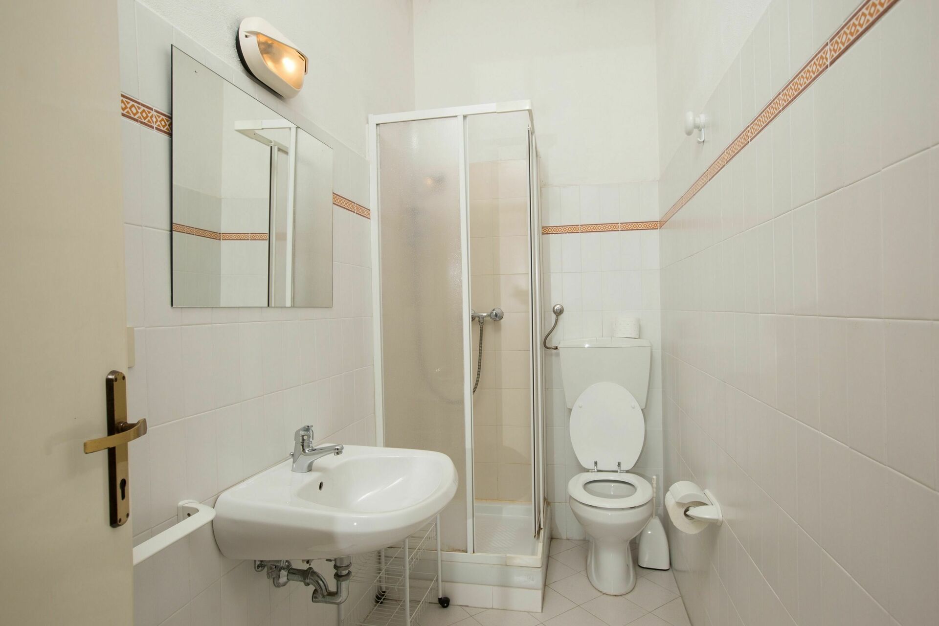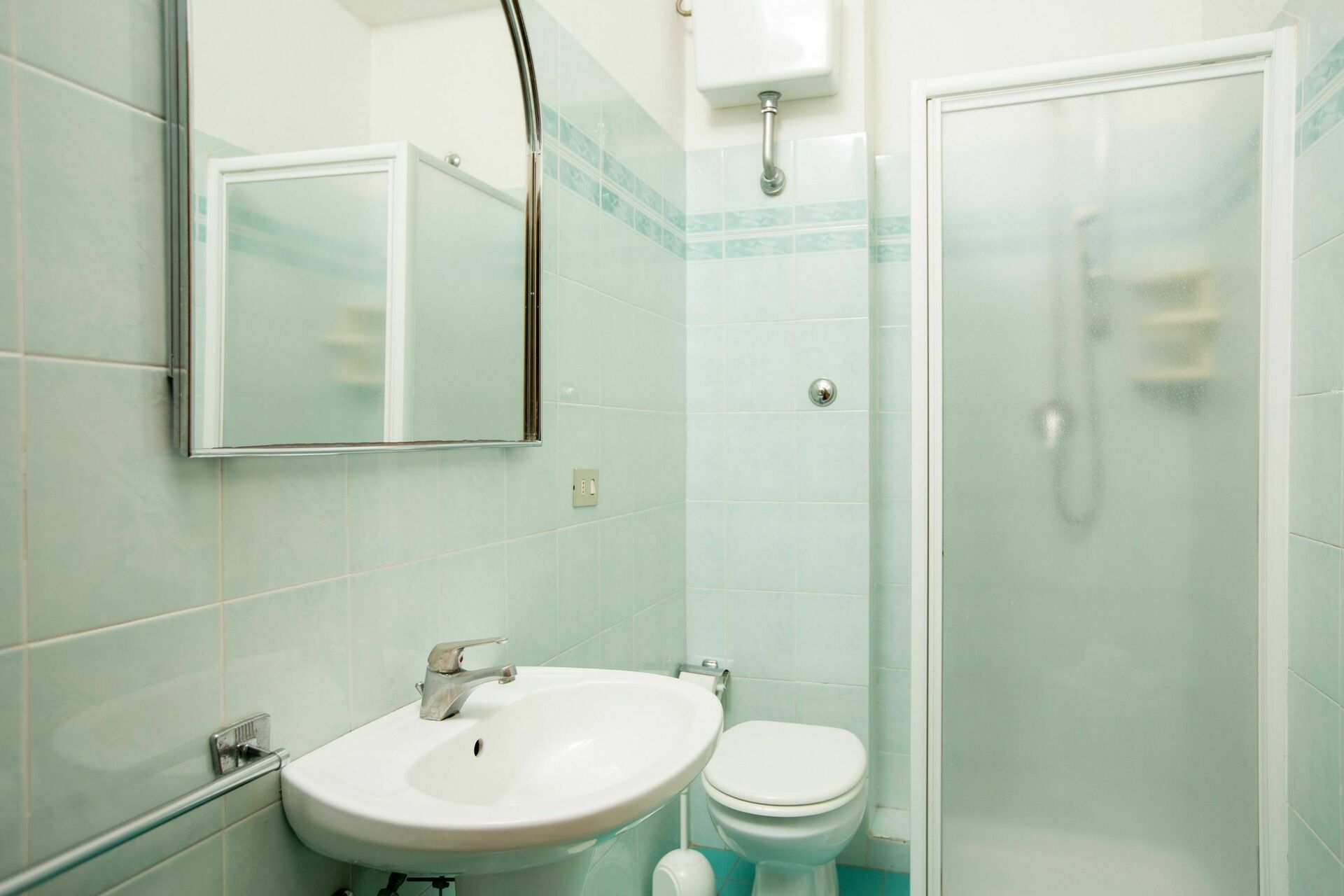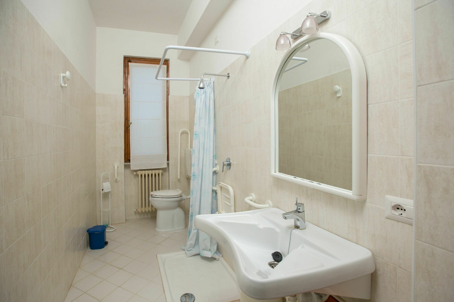 Piano terreno rialzato: ingresso su cucinotto (fornino elettrico, freezer, TV), camera con 2 letti singoli, 2 camere matrimoniali, 2 bagni entrambi con doccia (di cui uno adatto a disabili).