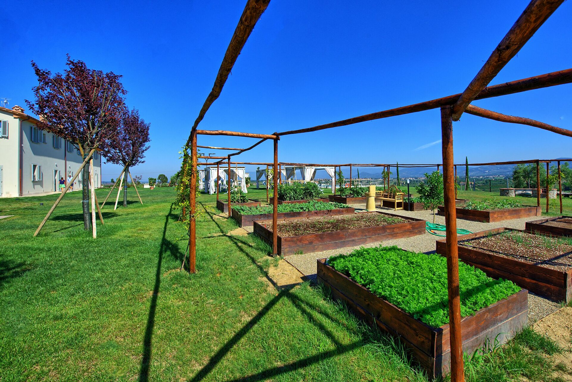 Un grande giardino con vista panoramica è a disposizione degli ospiti e la nuovissima piscina vi aspetta per rinfrescarvi nelle giornate estive più calde. Dei comodi gazebi sparsi intorno alla piscina offrono ombra e relax all'aria aperta.