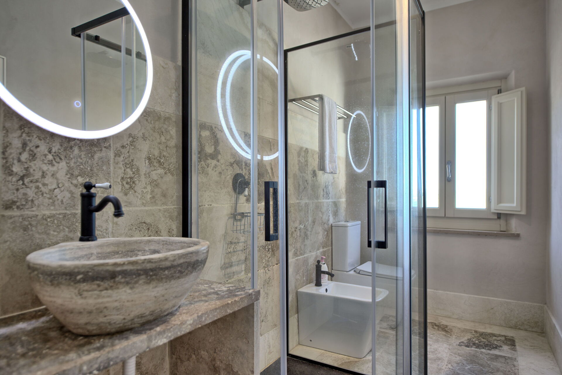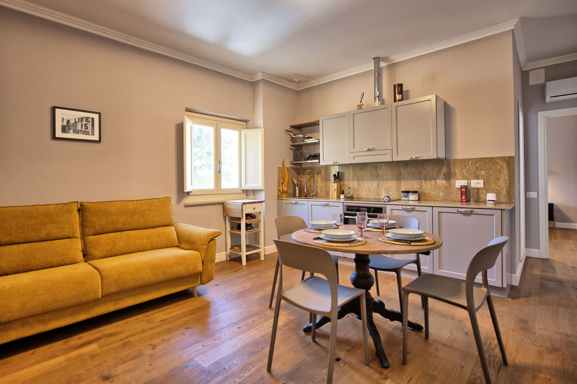 Primo piano: soggiorno (smart TV, aria condizionata) con divano letto matrimoniale, zona pranzo e angolo cottura (lavastoviglie, forno, frigorifero, macchina da caffè espresso, tostapane), camera matrimoniale (aria condizionata), bagno con doccia.