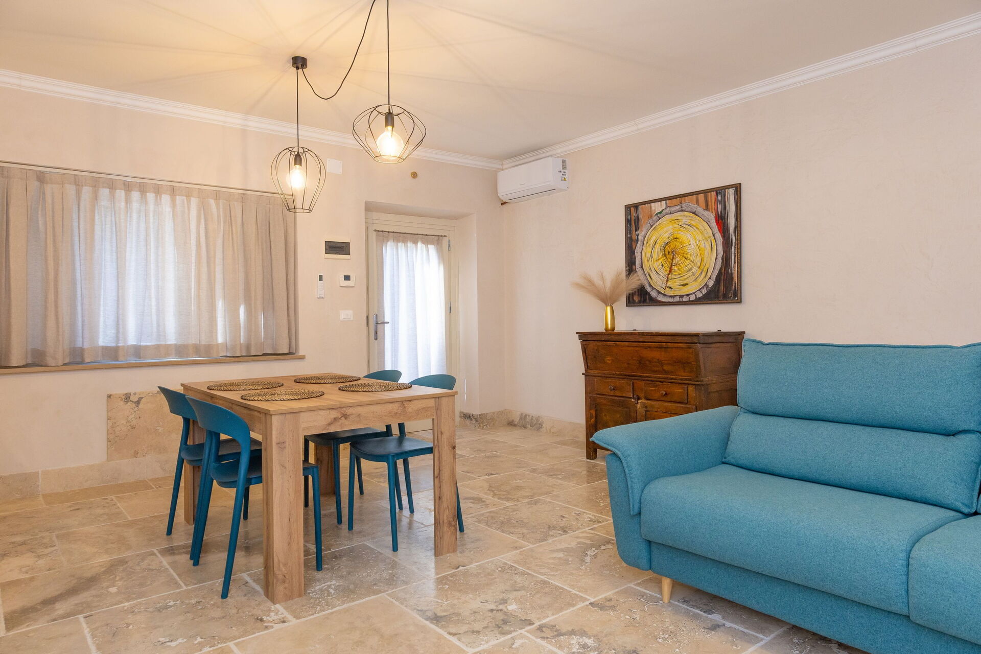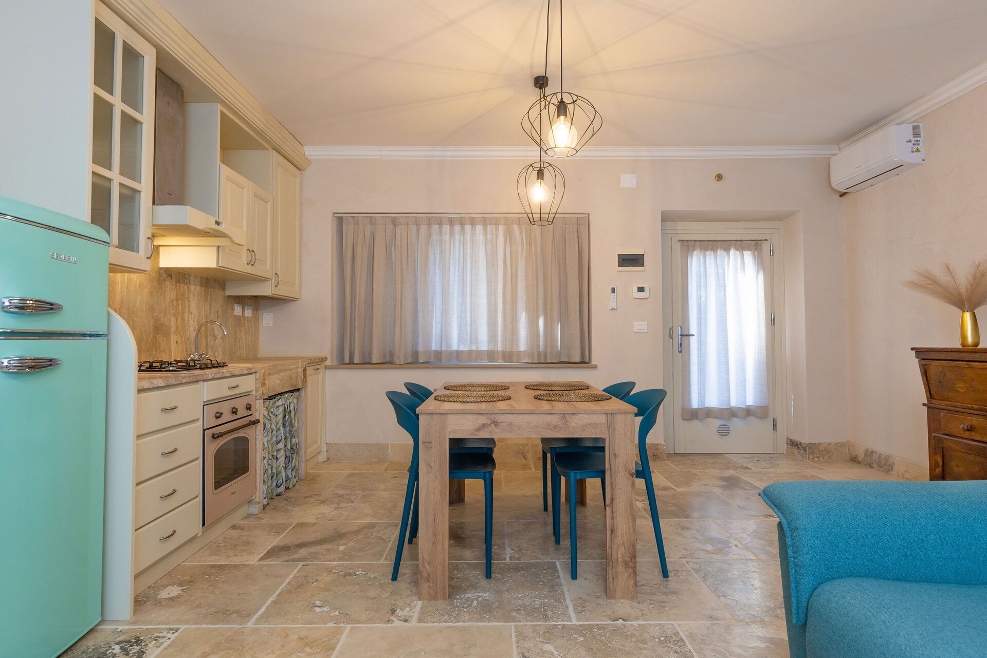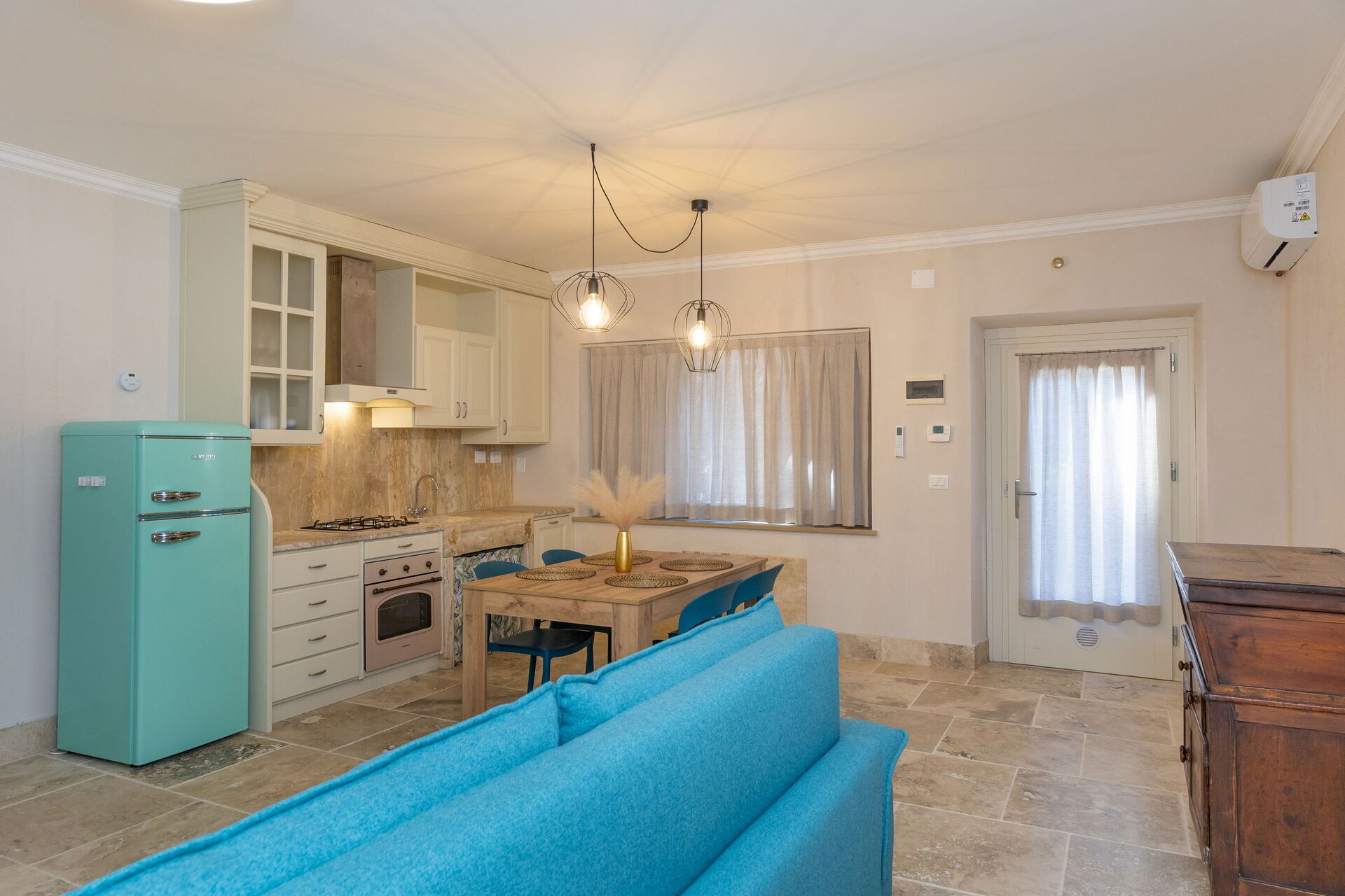 Piano terreno rialzato: soggiorno (smart tv, aria condizionata) con divano letto matrimoniale, zona pranzo e angolo cottura (lavastoviglie, forno, frigorifero, macchina da caffè espresso, tostapane), camera matrimoniale (aria condizionata), bagno con doccia.