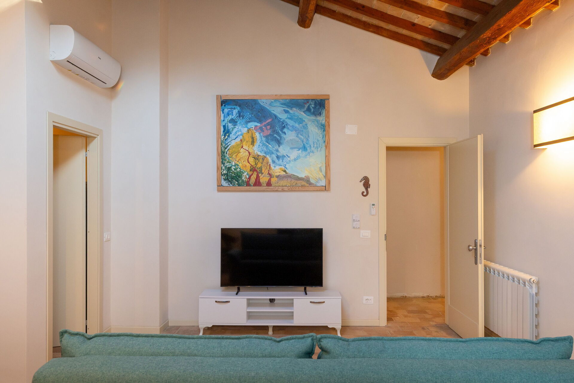 Primo piano: soggiorno (smart TV, aria condizionata) con divano letto matrimoniale, zona pranzo e angolo cottura (lavastoviglie, forno, frigorifero, macchina da caffè espresso, tostapane), camera matrimoniale (aria condizionata), bagno con doccia.