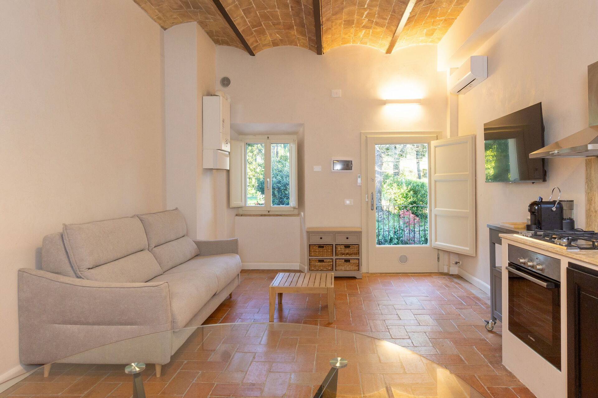Piano terreno rialzato: soggiorno (smart TV, aria condizionata) con divano letto matrimoniale, zona pranzo e angolo cottura (lavastoviglie, forno, frigorifero, macchina da caffè espresso, tostapane), camera matrimoniale (aria condizionata), bagno con doccia.