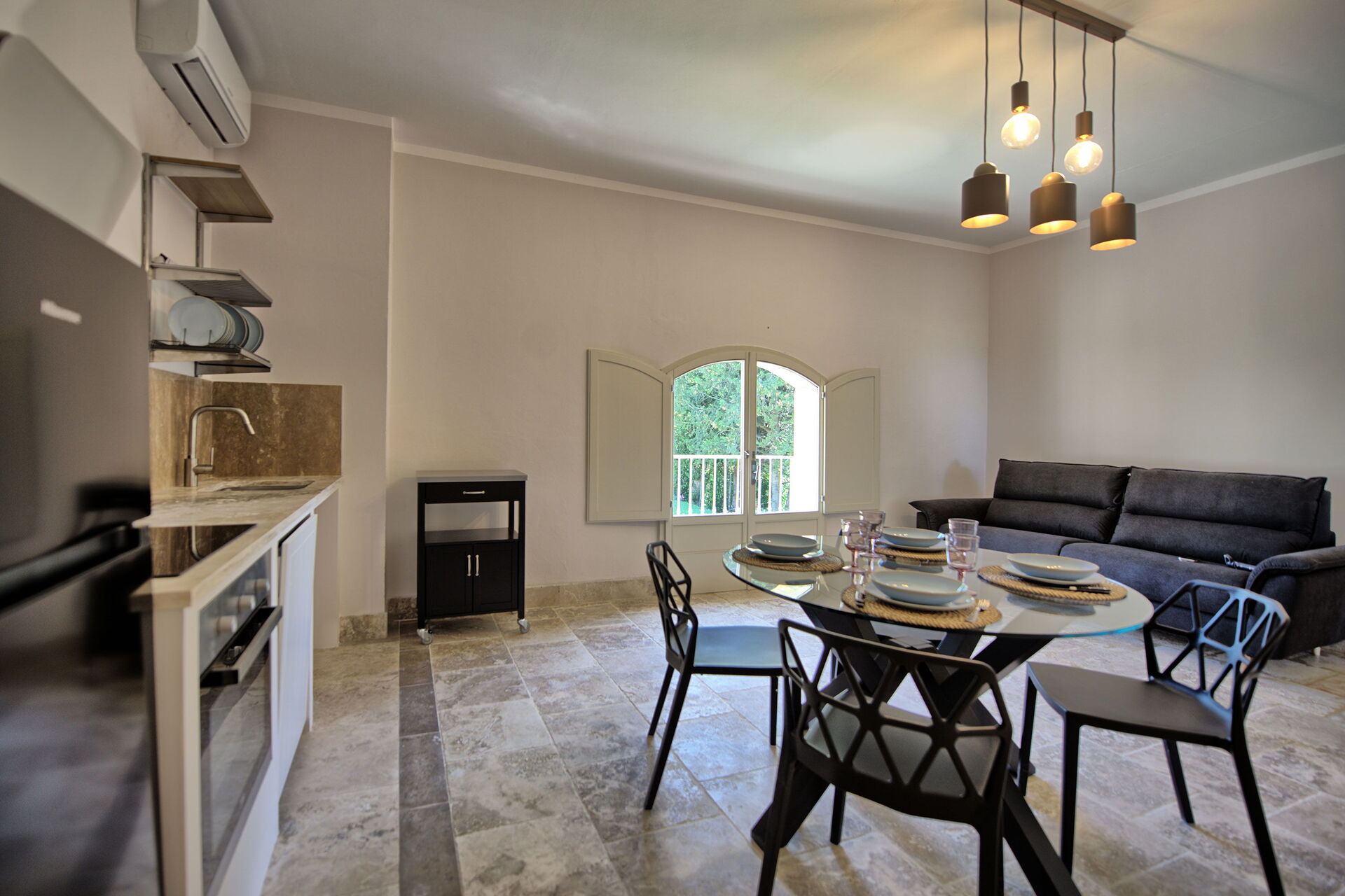 Primo piano: soggiorno (smart TV, aria condizionata) con divano letto matrimoniale, zona pranzo e angolo cottura (lavastoviglie, forno, frigorifero, macchina da caffè espresso, tostapane), camera matrimoniale (aria condizionata), bagno con doccia.