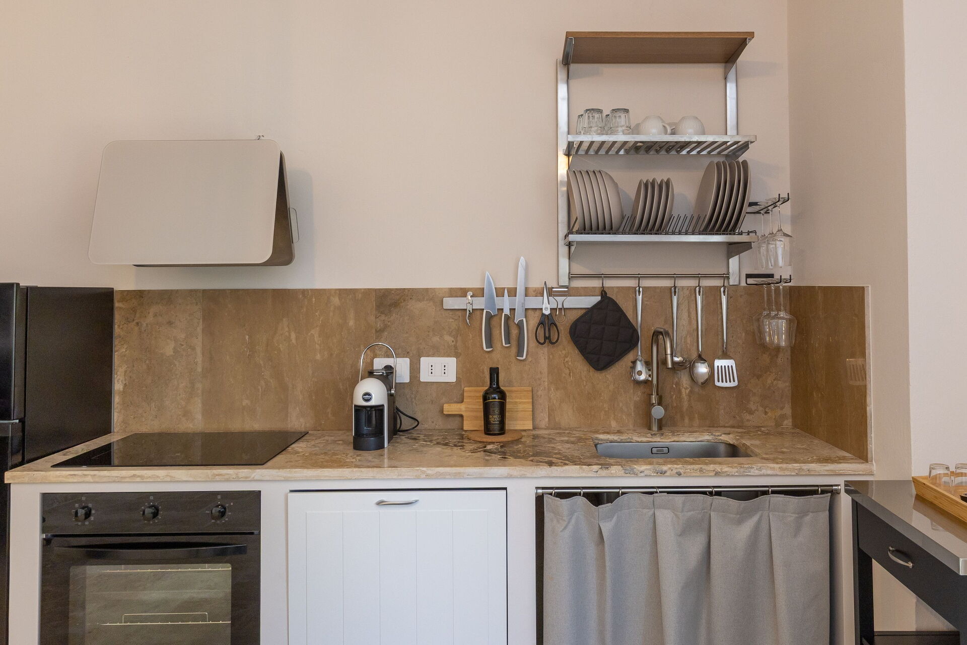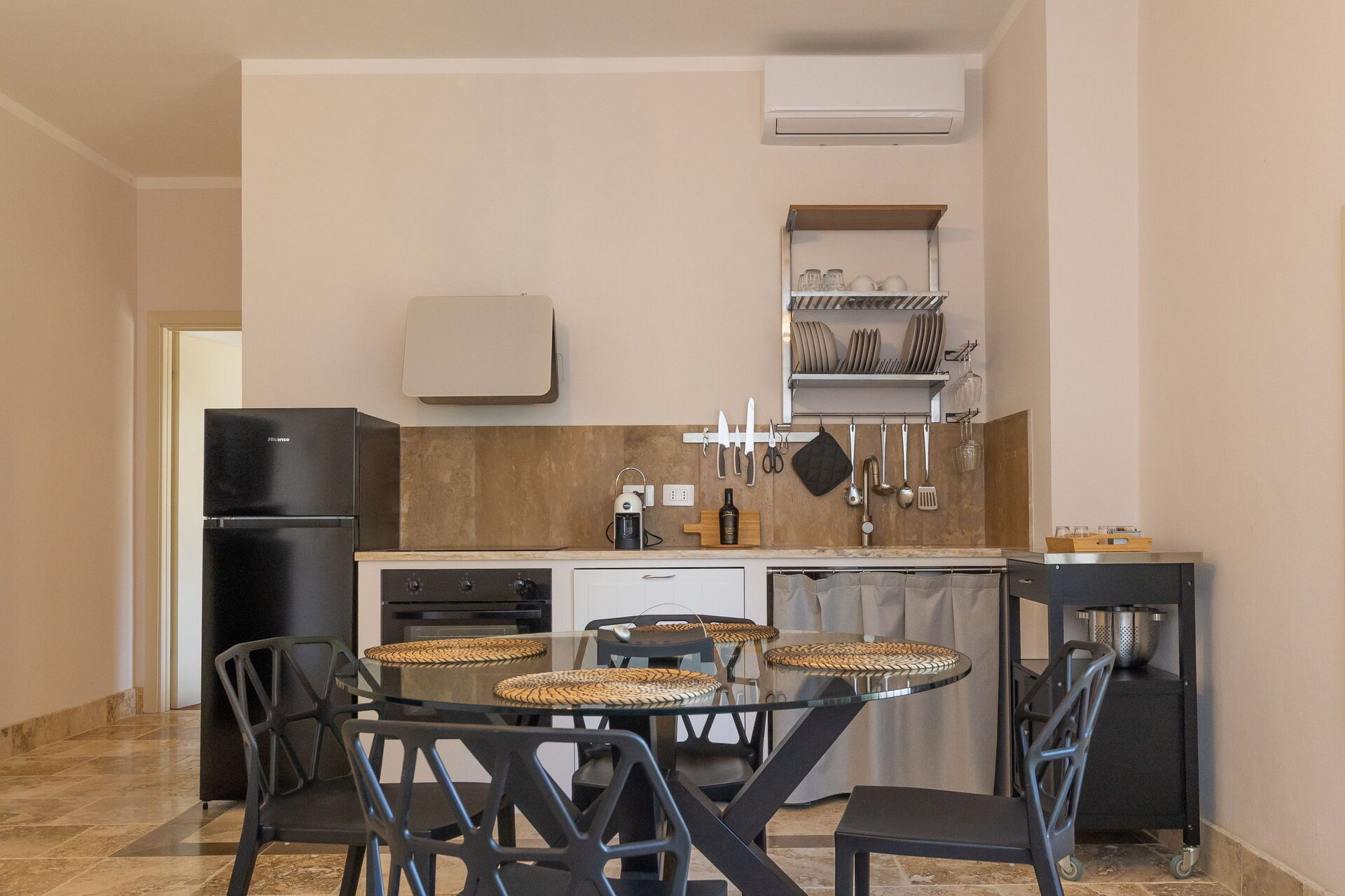 Primo piano: soggiorno (smart TV, aria condizionata) con divano letto matrimoniale, zona pranzo e angolo cottura (lavastoviglie, forno, frigorifero, macchina da caffè espresso, tostapane), camera matrimoniale (aria condizionata), bagno con doccia.