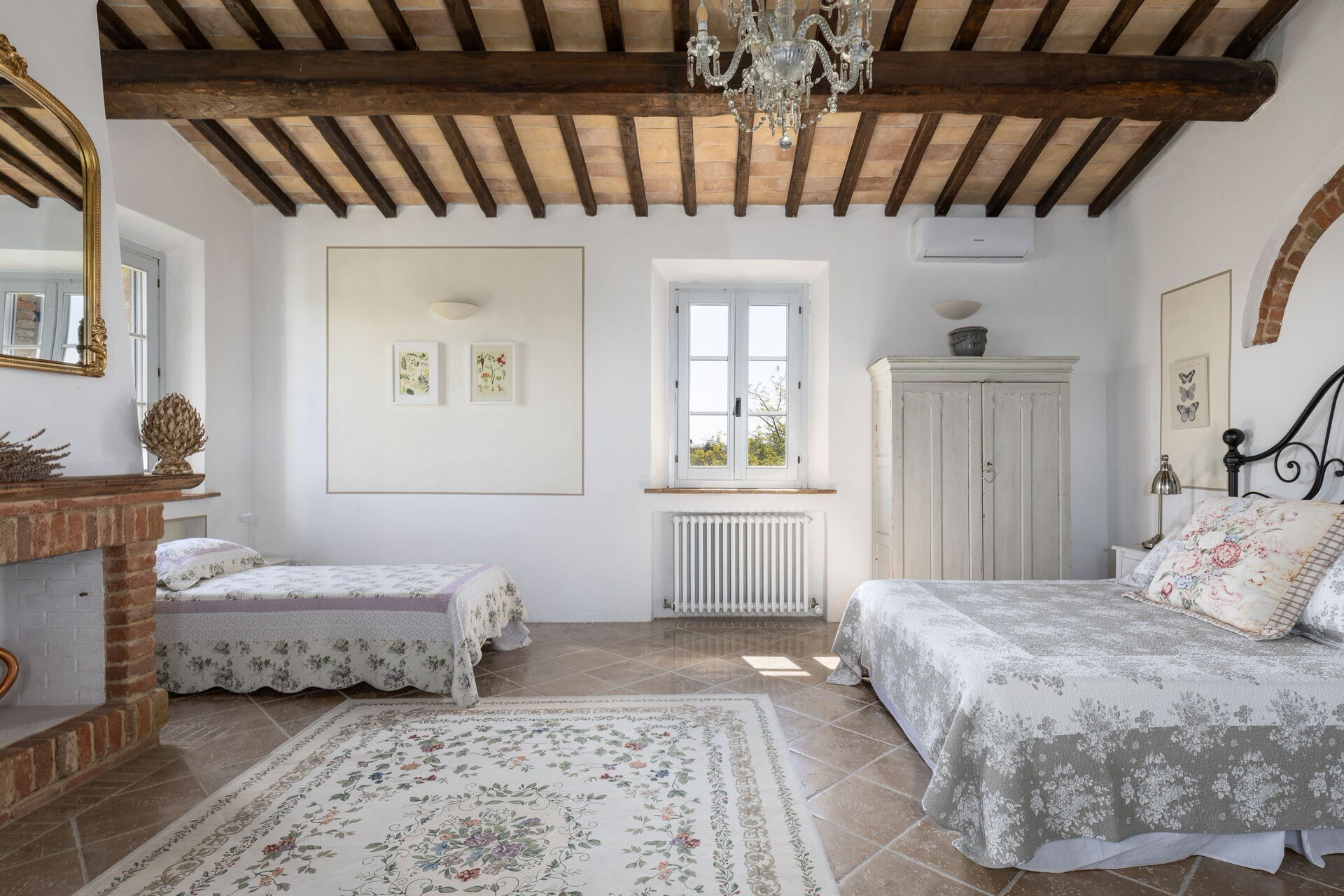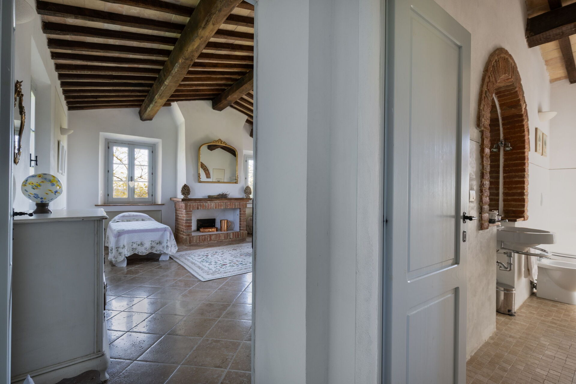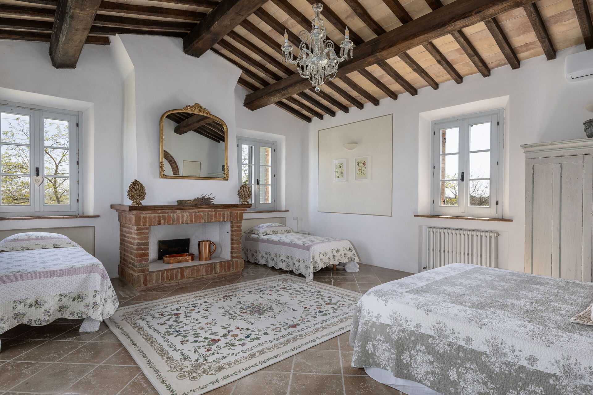 Primo piano (accessibile sia dal piano terreno della casa sia da fuori tramite una scalinata esterna): camera matrimoniale (aria condizionata) con bagno privato con doccia e accesso ad un’ampia terrazza coperta privata, camera matrimoniale (aria condizionata) con accesso sull’esterno, bagno con doccia, ampia camera (aria condizionata) con letto matrimoniale e 2 letti singoli (il camino non è utilizzabile).
