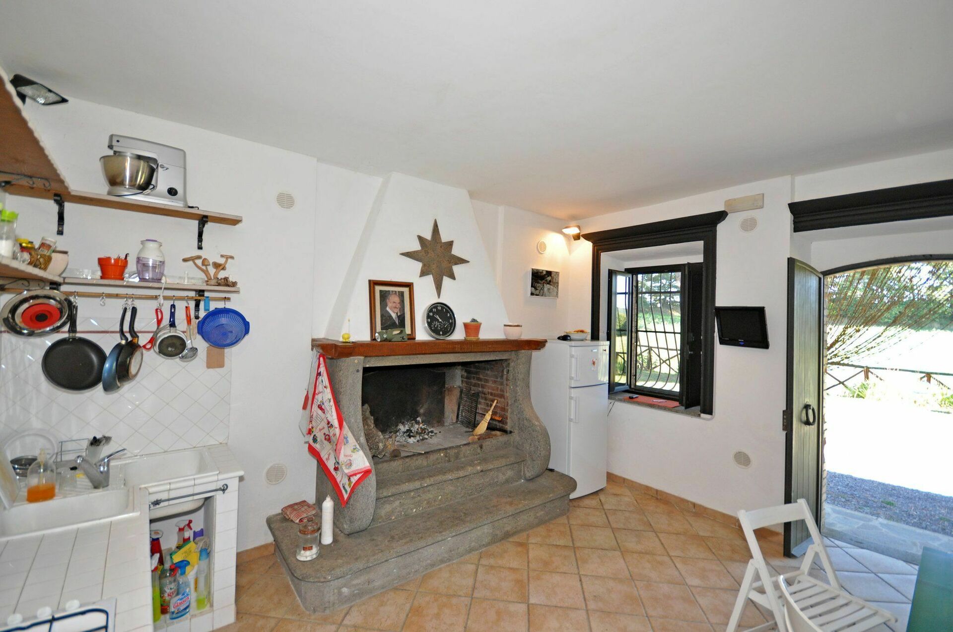 Piano terreno: ingresso su zona pranzo (TV) con camino e angolo cottura (forno, freezer), WC.