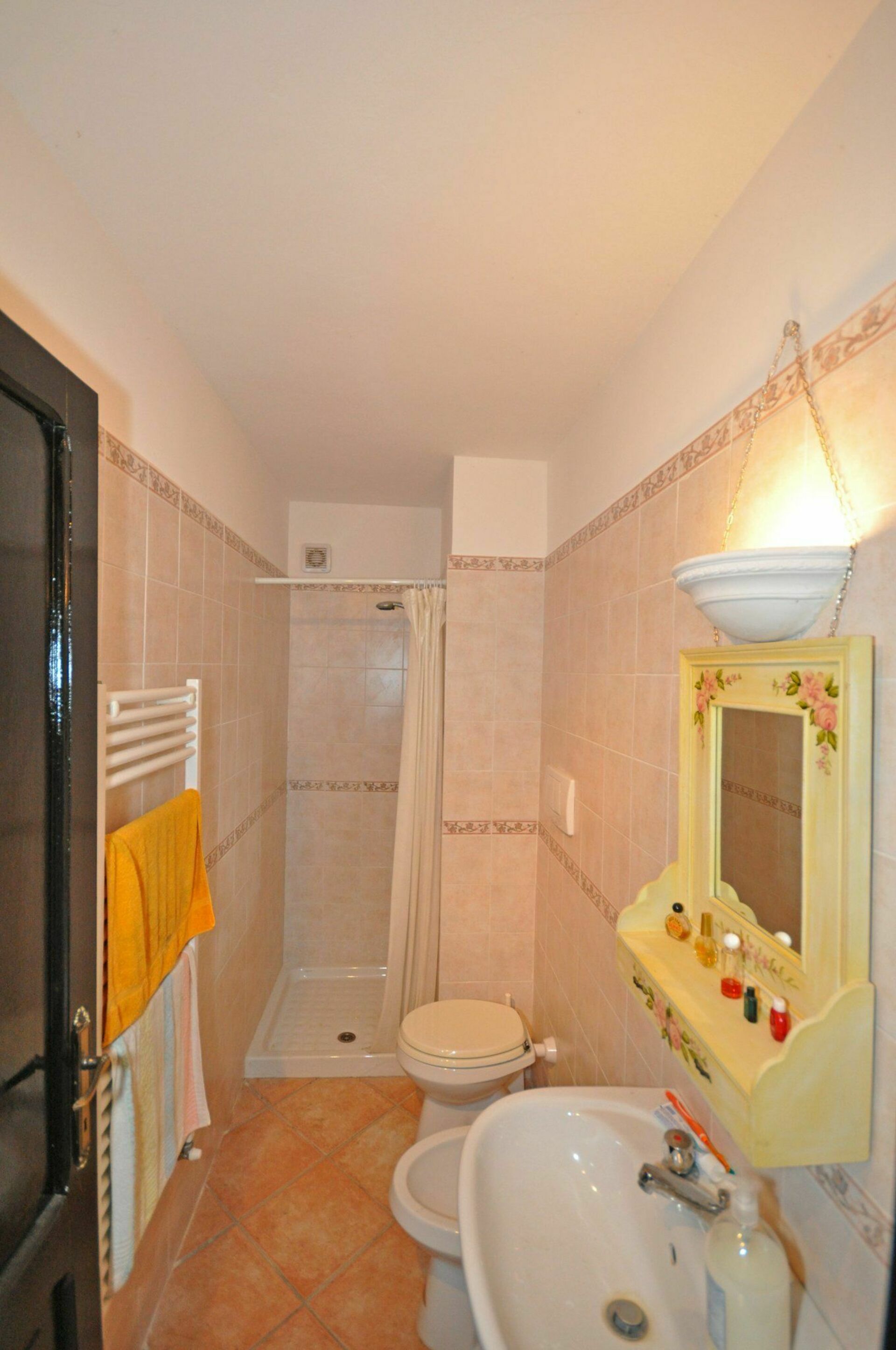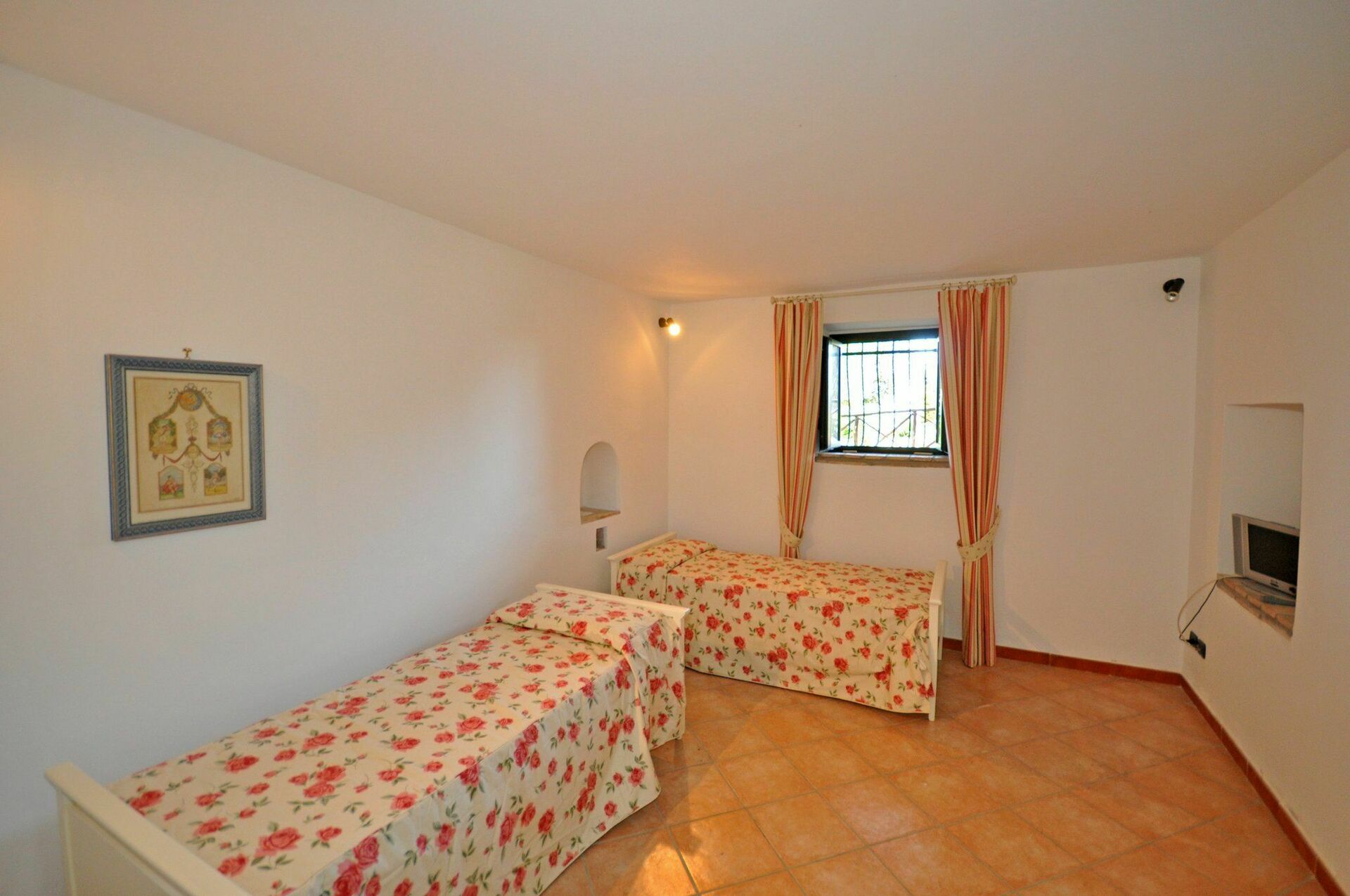 1 gradino più in basso: bagno con doccia, camera con un letto singolo, camera matrimoniale (TV).