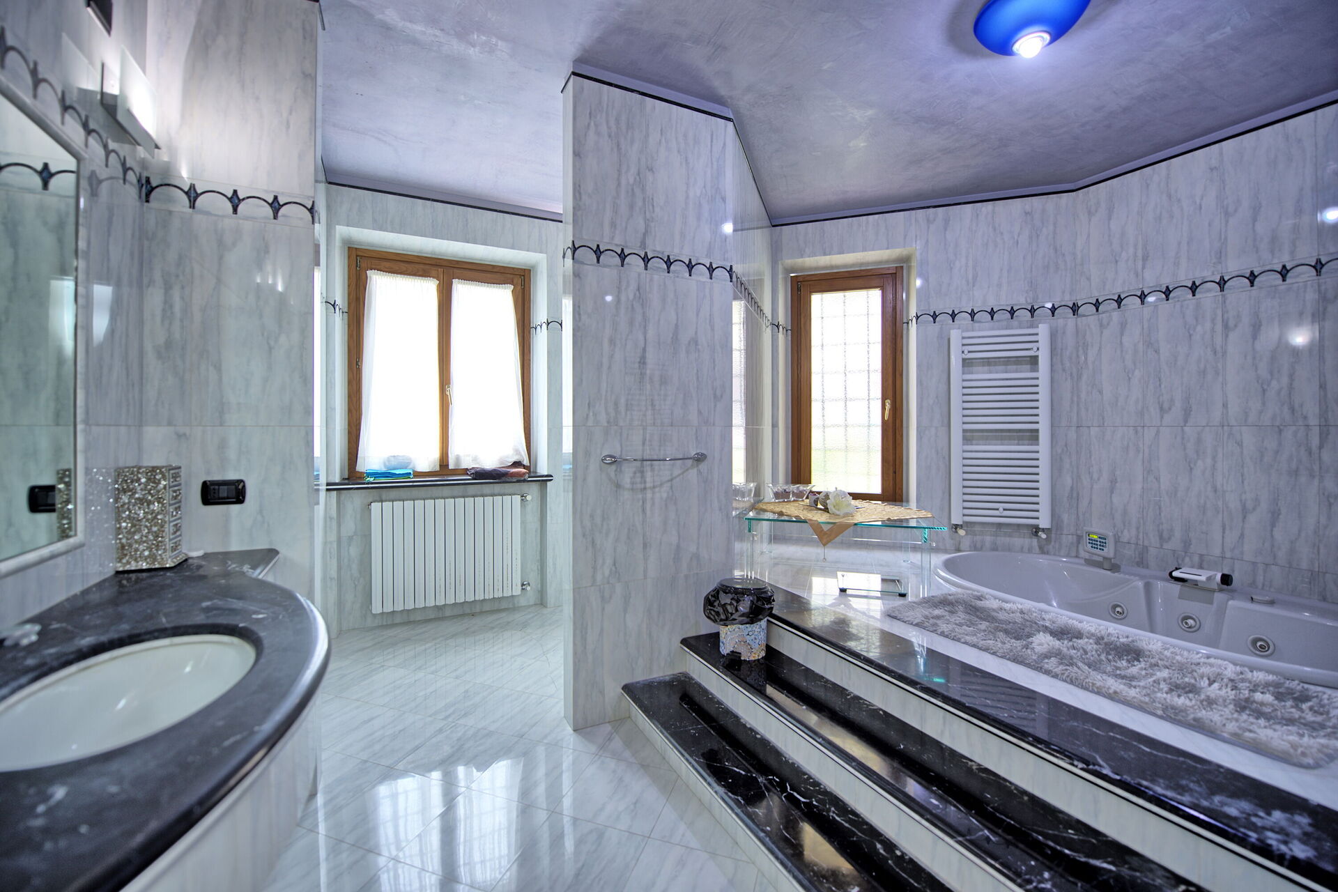 7 gradini sopra: camera matrimoniale (aria condizionata) con bagno privato con doccia, wc, camera matrimoniale (aria condizionata) con bagno privato con vasca idromassaggio e doccia.
