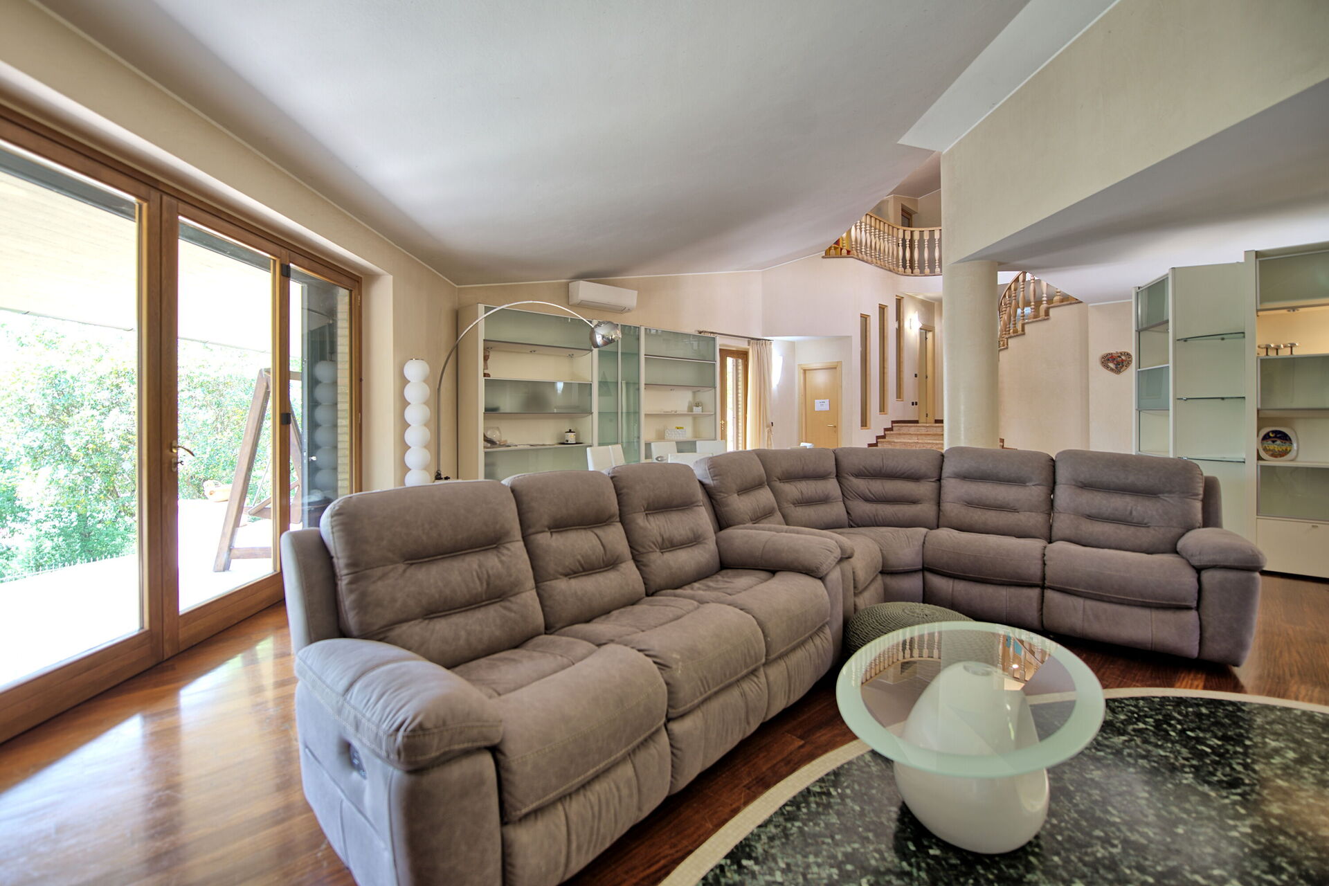 Piano terreno: ampio soggiorno (camino, tv, aria condizionata) e zona pranzo con accesso alla veranda e al giardino, cucina (piano cottura, forno, freezer, lavastoviglie, macchina da caffè, microonde, frigorifero).
