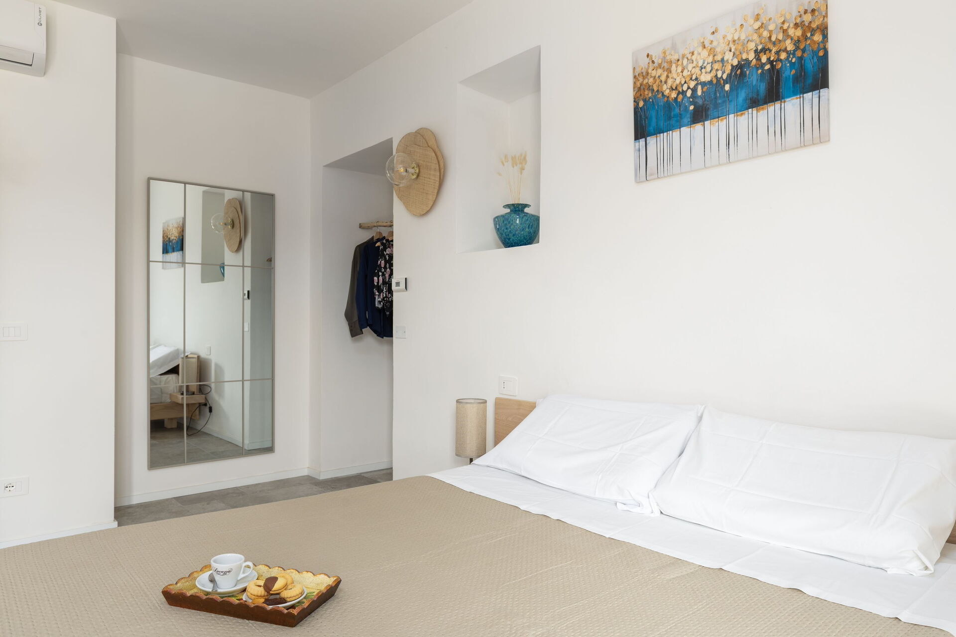 Piano terreno: ingresso su ampia zona giorno (pianoforte) e cucina (forno, freezer, microonde, macchina da caffè Nespresso, tostapane, bollitore, lavatrice), camera matrimoniale, bagno con doccia.