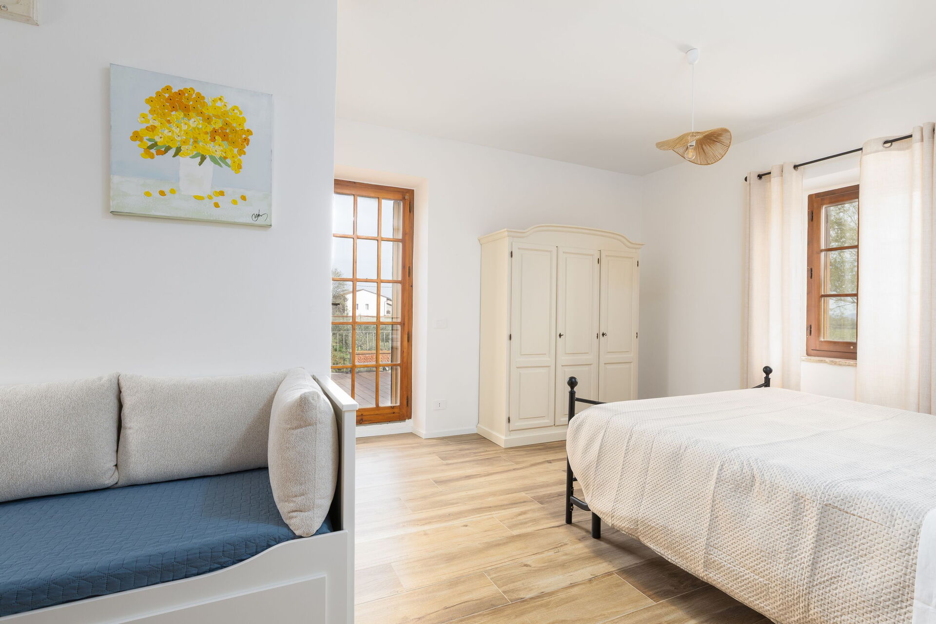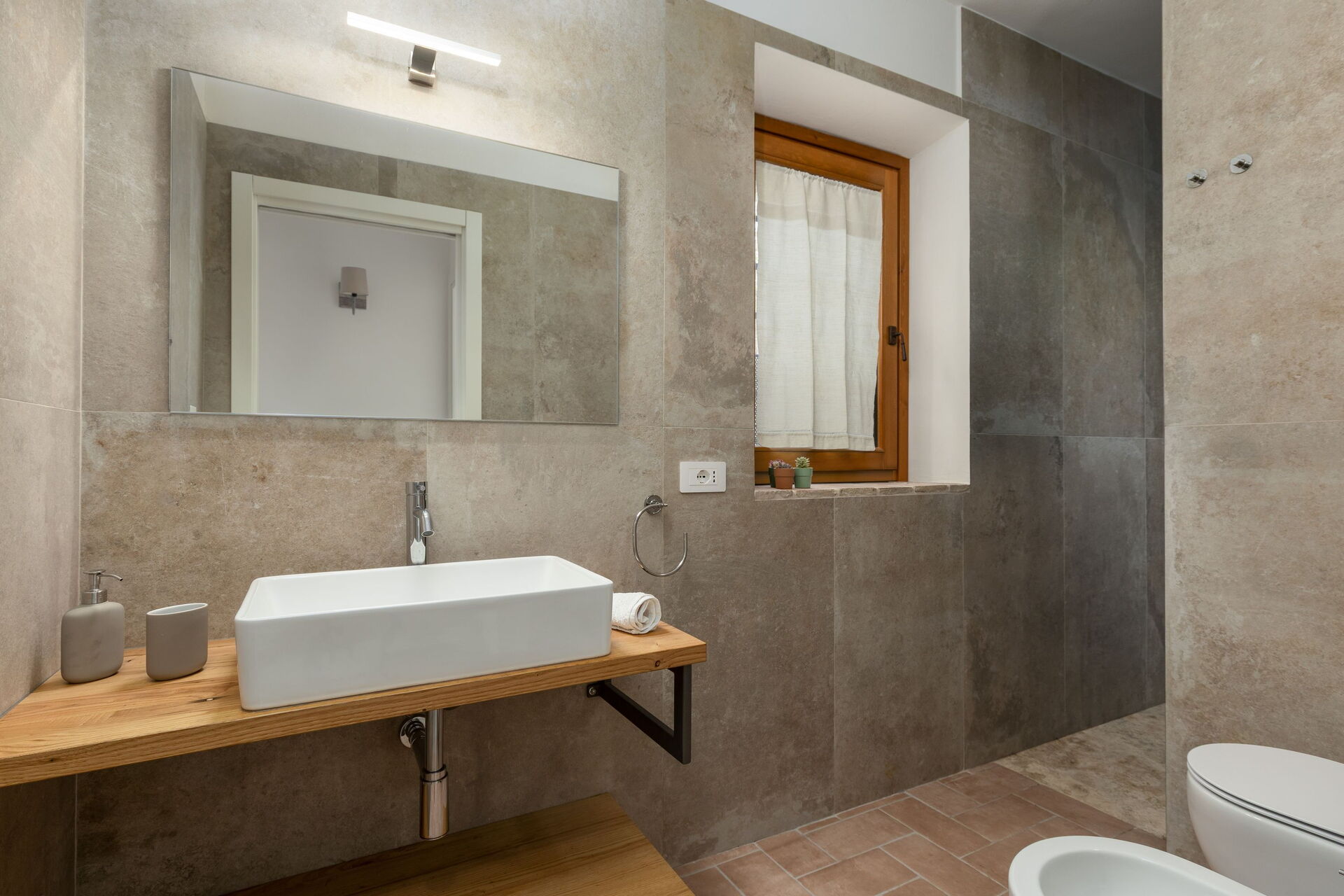 Primo piano: soggiorno con smart TV, camera matrimoniale, bagno con doccia, camera con letto matrimoniale + letto singolo e bagno privato con doccia e con accesso a panoramica terrazza privata.