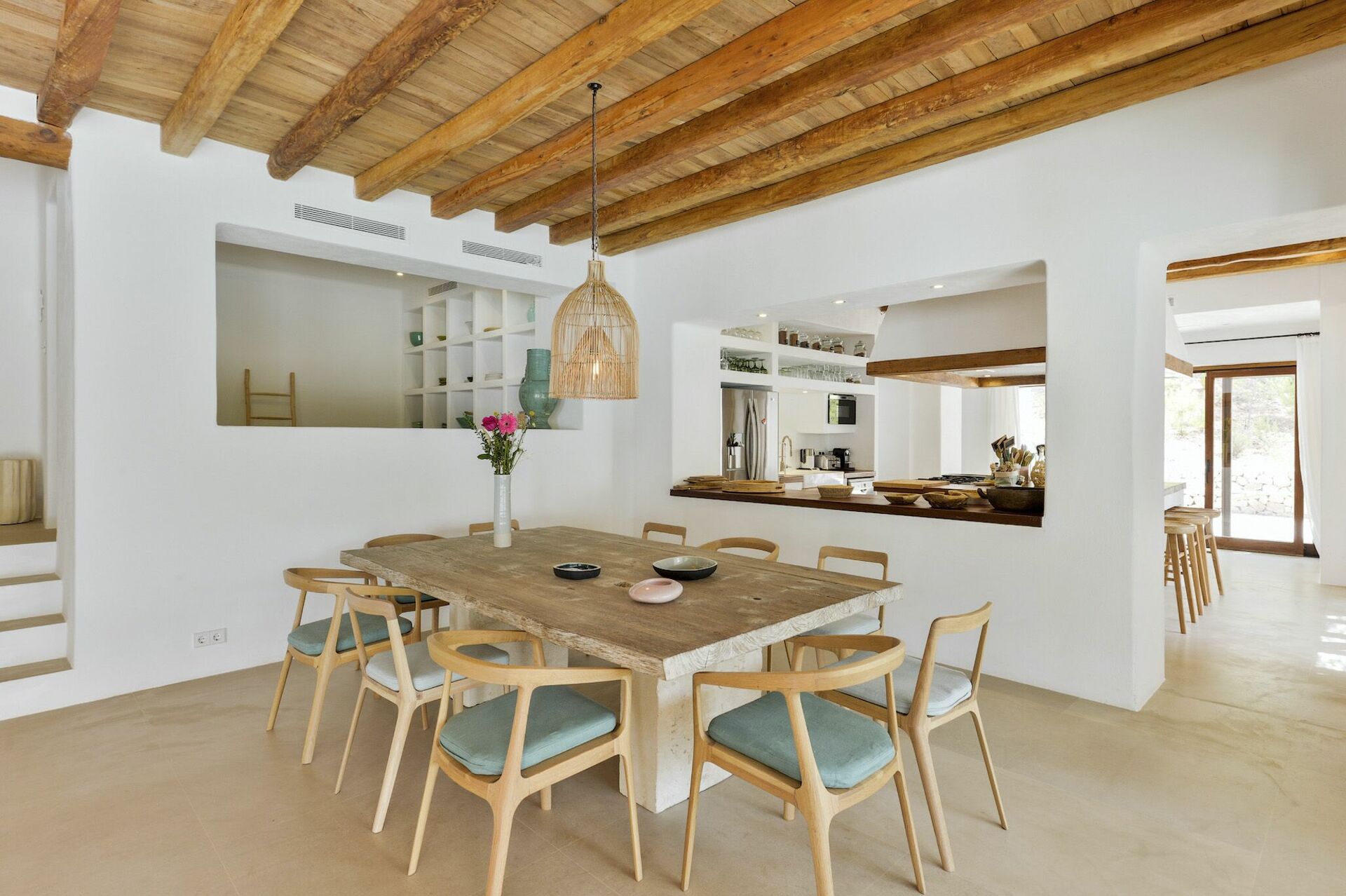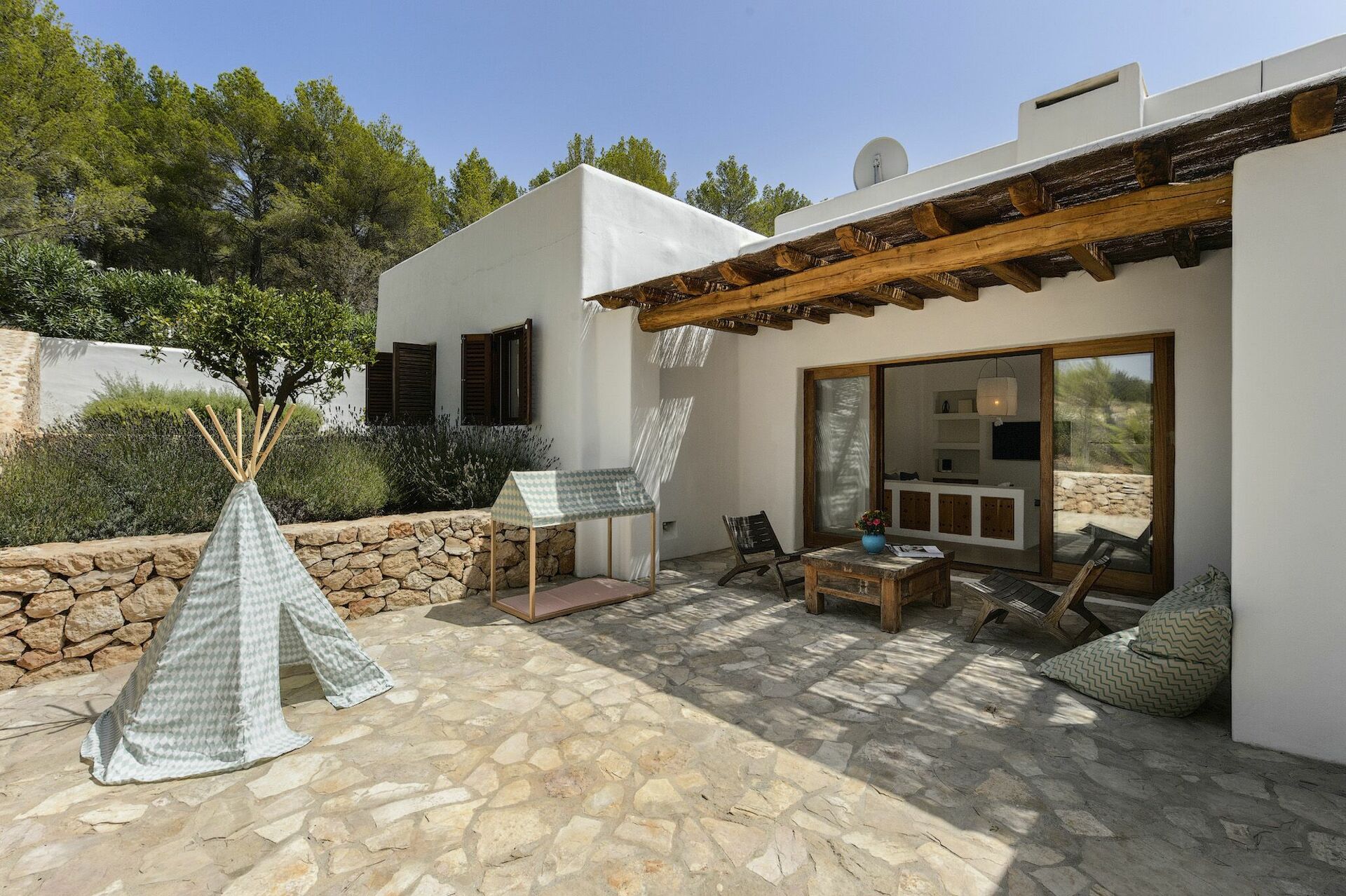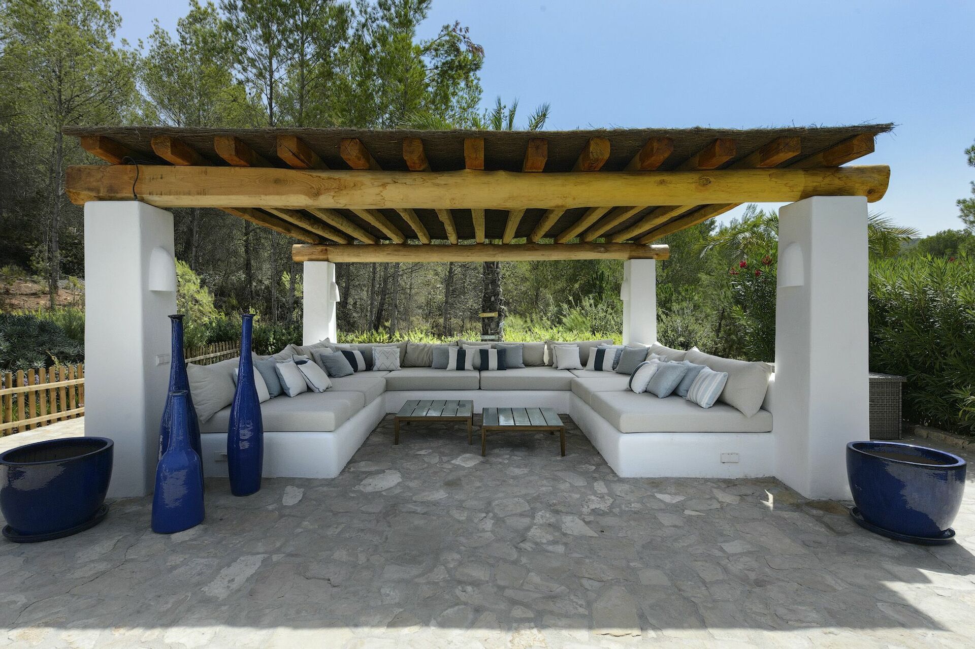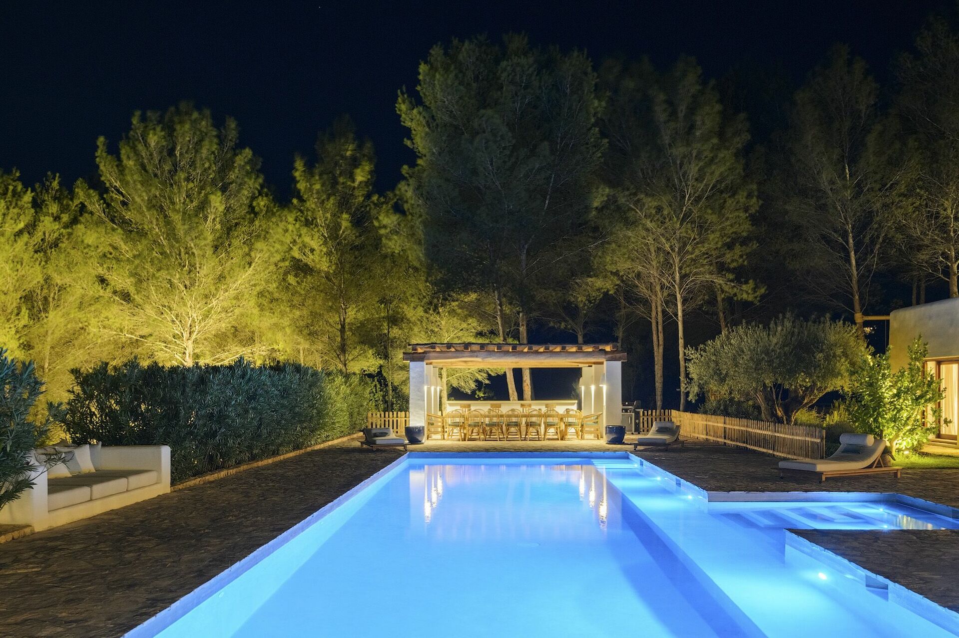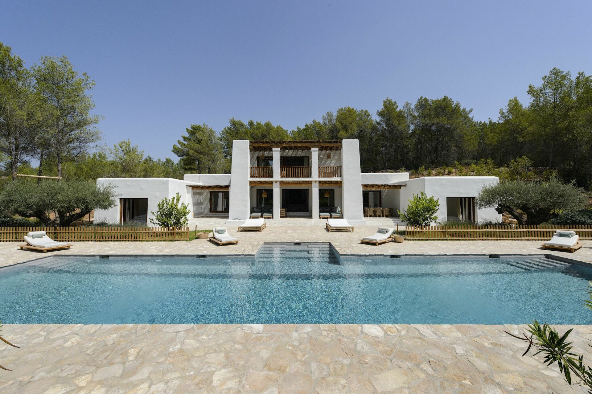 All'interno, la villa è sviluppata su due piani e può ospitare fino a 10 persone grazie a 5 camere da letto, ognuna dotata del proprio bagno privato, di ampi guardaroba e di aria condizionata. Le aree comuni sono state arredate con gusto, seguendo il tipico stile delle case di Ibiza e dotandole dei migliori comfort per garantire il massimo del lusso e della comodità ai nostri ospiti. Non mancano un'area fitness, una sala cinema e una cucina completamente attrezzata con i più moderni elettrodomestici.