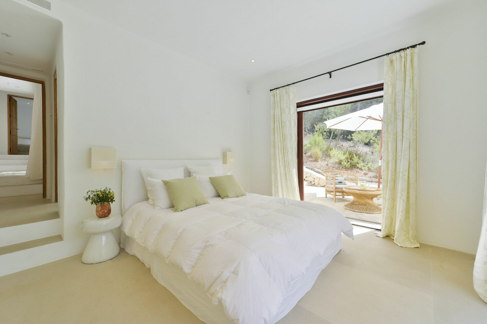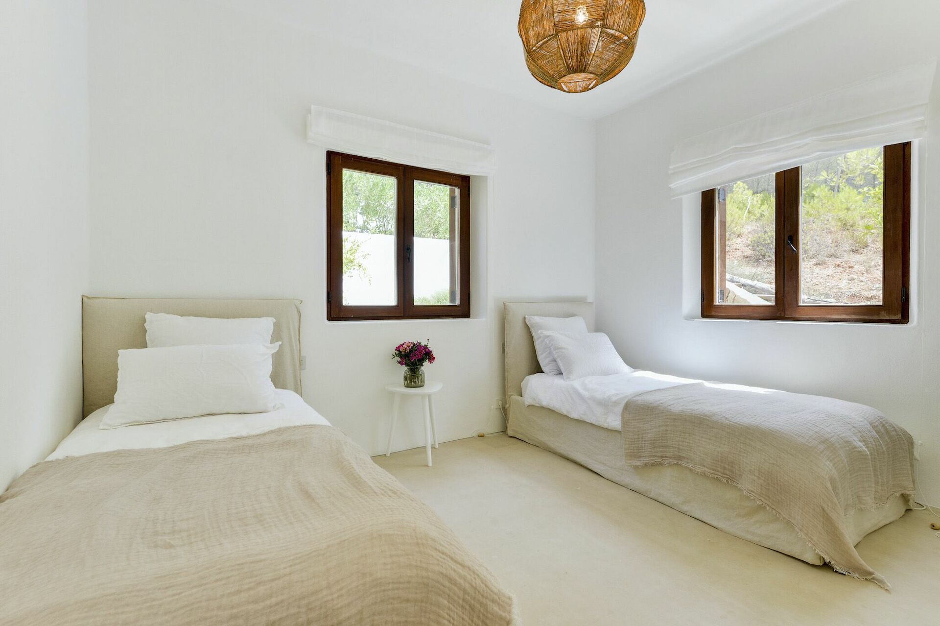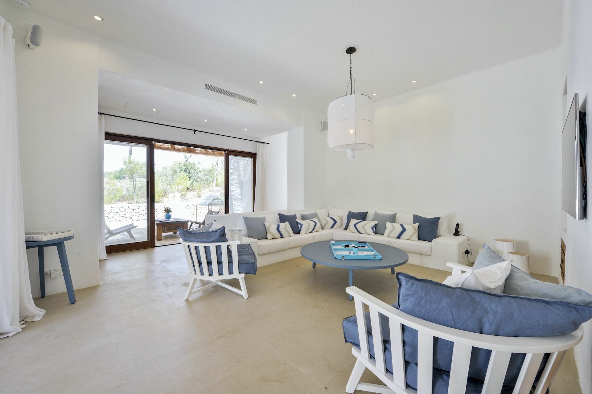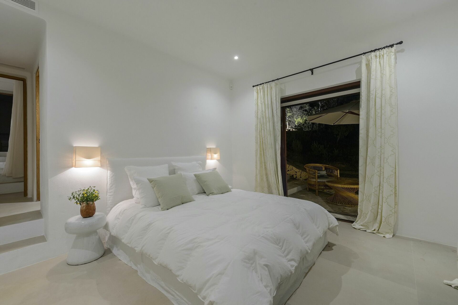 All'interno, la villa è sviluppata su due piani e può ospitare fino a 10 persone grazie a 5 camere da letto, ognuna dotata del proprio bagno privato, di ampi guardaroba e di aria condizionata. Le aree comuni sono state arredate con gusto, seguendo il tipico stile delle case di Ibiza e dotandole dei migliori comfort per garantire il massimo del lusso e della comodità ai nostri ospiti. Non mancano un'area fitness, una sala cinema e una cucina completamente attrezzata con i più moderni elettrodomestici.