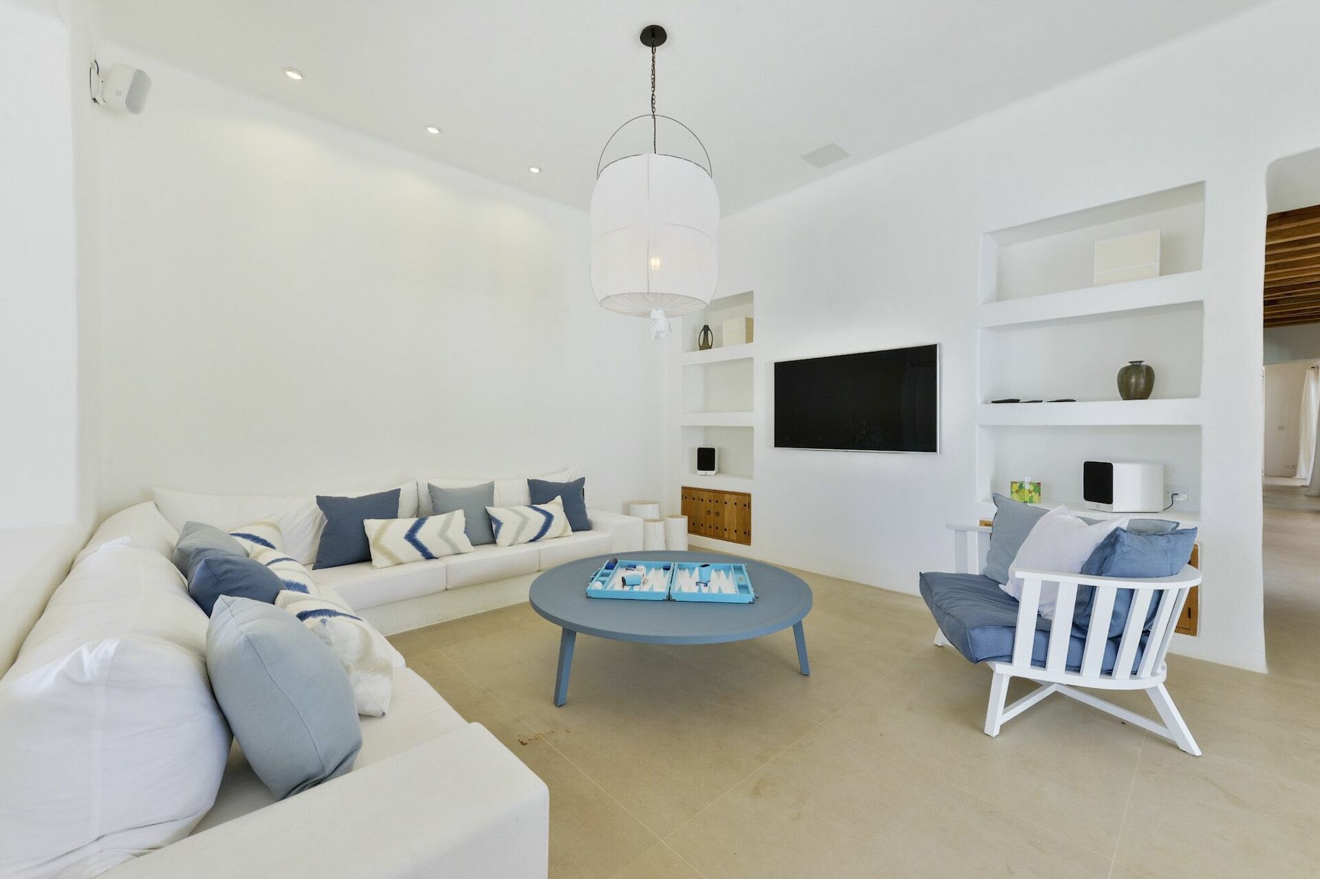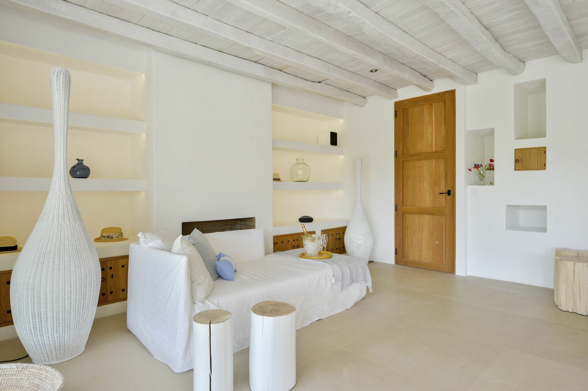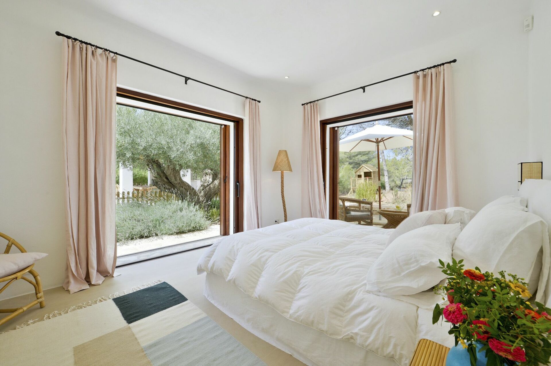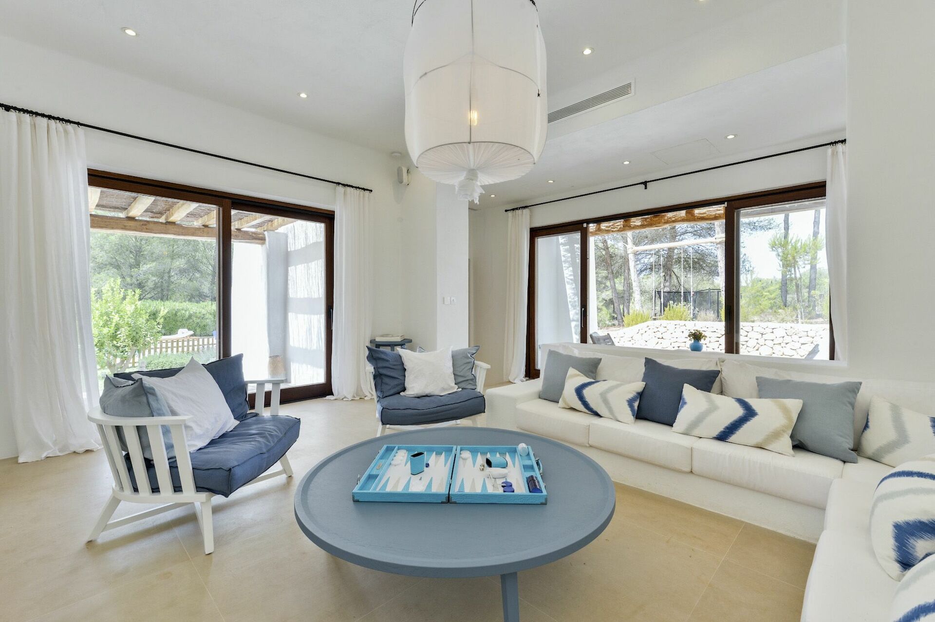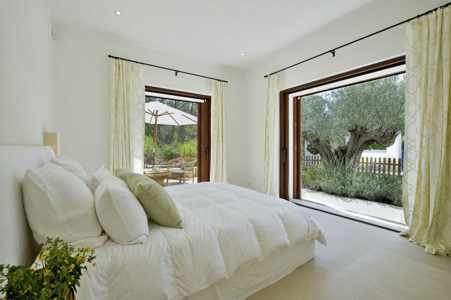 All'interno, la villa è sviluppata su due piani e può ospitare fino a 10 persone grazie a 5 camere da letto, ognuna dotata del proprio bagno privato, di ampi guardaroba e di aria condizionata. Le aree comuni sono state arredate con gusto, seguendo il tipico stile delle case di Ibiza e dotandole dei migliori comfort per garantire il massimo del lusso e della comodità ai nostri ospiti. Non mancano un'area fitness, una sala cinema e una cucina completamente attrezzata con i più moderni elettrodomestici.